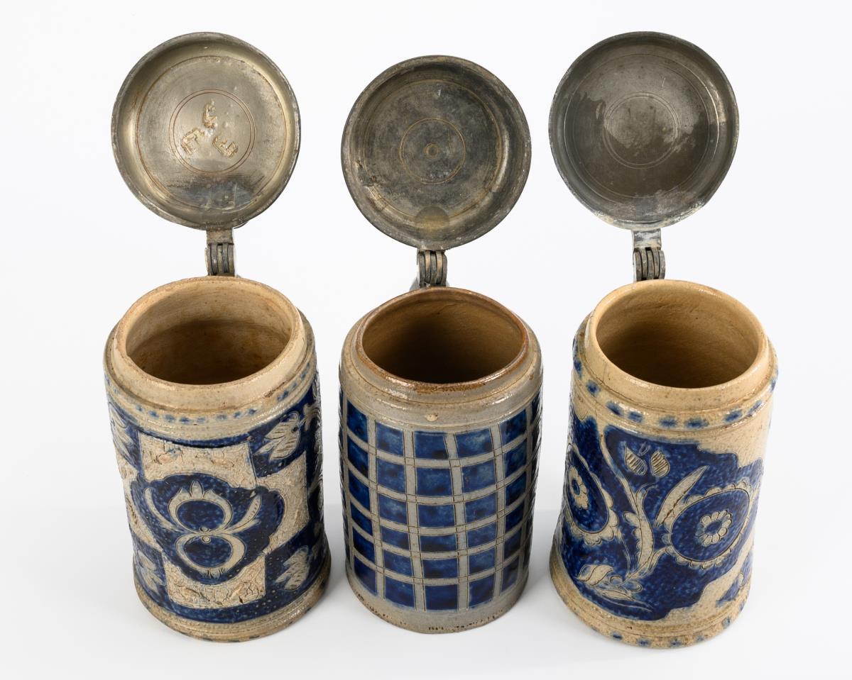 Zylinderkrüge mit Ohrenhenkeln und verschiedenartigen kunstvollen Dekoren. Jeweils mit Zinndeckel und Kugeldrücker, teils graviert und innen gepunzt. Alters- und Gebrauchsspuren, jeweils mit Rissen, partiell leicht bestoßen.