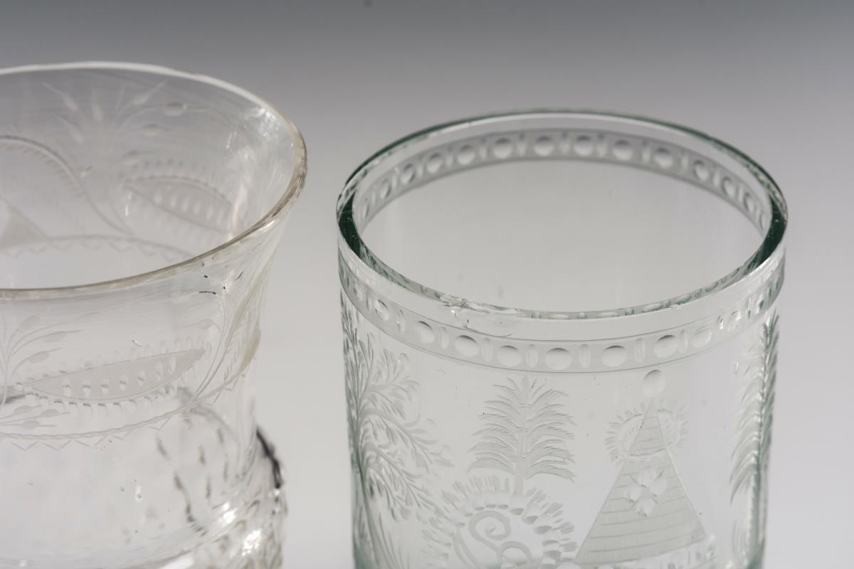 Zylinderbecher mit der Darstellung einer Insel mit Pyramide und Monogramm. / Kraterbecher mit wabenfacettiertem Stand und floralem Dekor. 1x beschliffene Randbestoßung, 1x kleine Randbestoßungen.