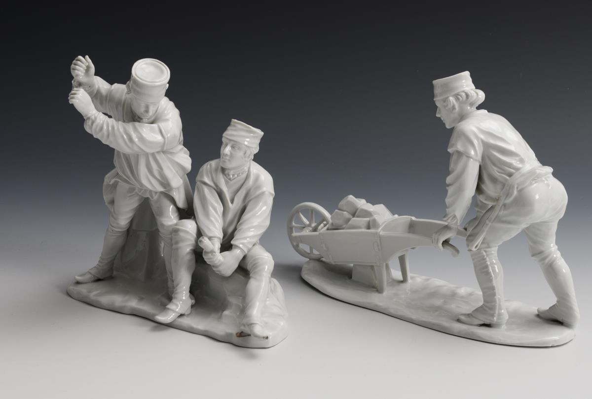 Karrenläufer, Einmannbohrer, Zweimannbohrer, Gedingarbeiter, Schrämer und Ruthengänger. 2 Hände abgebrochen (1x lose anbei), Werkzeuge teils bestoßen, 1 Werkzeug fehlt, 1x Chip am Sockelrand, 1x geklebter Ausbruch am Sockelrand, 1x Haarriss am Fuß.