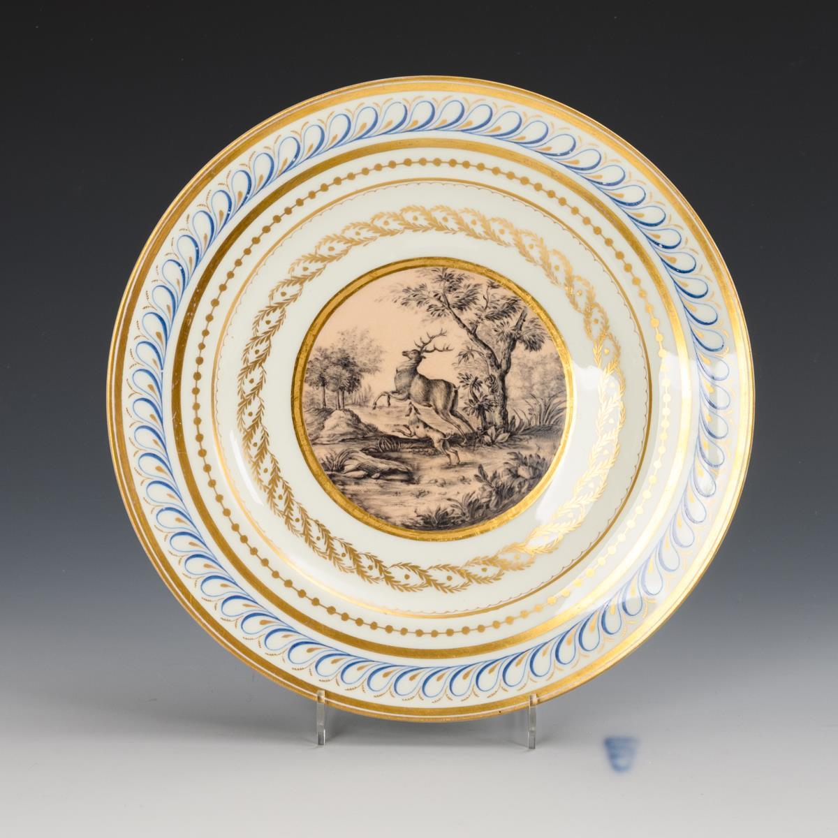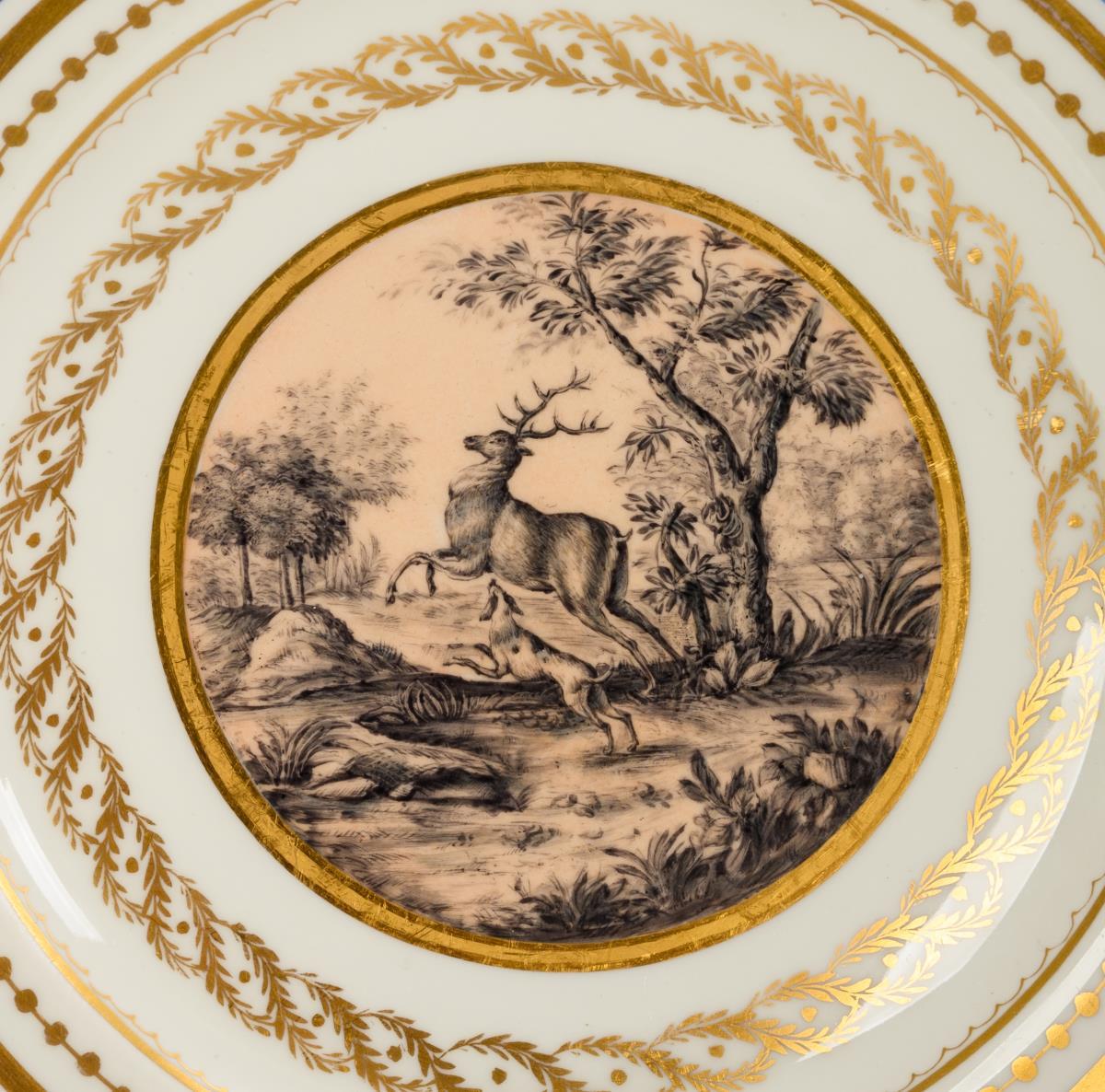Im Spiegel die Darstellung einer sepia- und schwarzlotgemalten Waldlandschaft mit Hirsch und Hund.