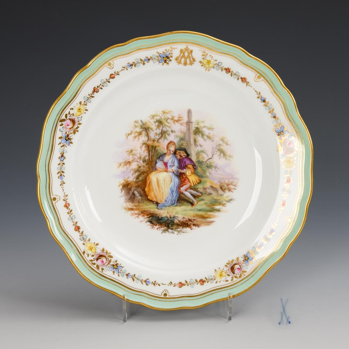 Form "Neuer Ausschnitt". Fahne mit mintgrünem Rand, Blütenkranz sowie dem Monogramm "MA", im Spiegel die Darstellung einer galanten Szene.