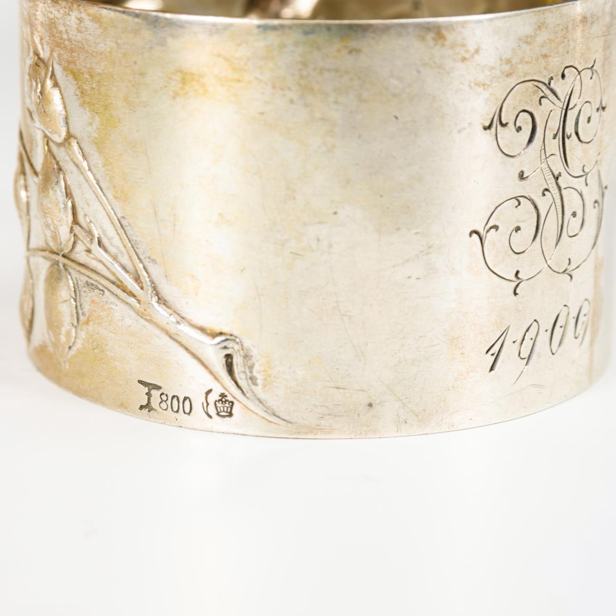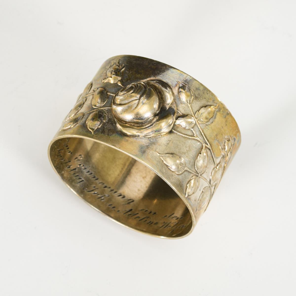 Versilbertes Handsieb mit silberner Tropfschale. / 2 Serviettenringe mit Reliefrosen und Gravur "FG 1909". Schälchen gedellt.