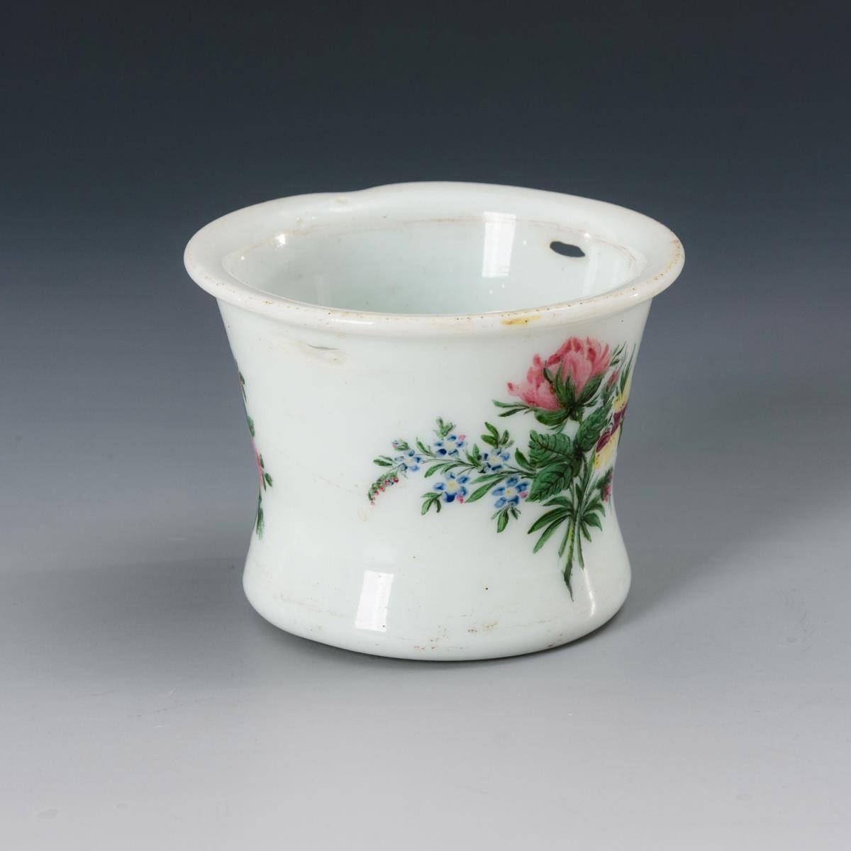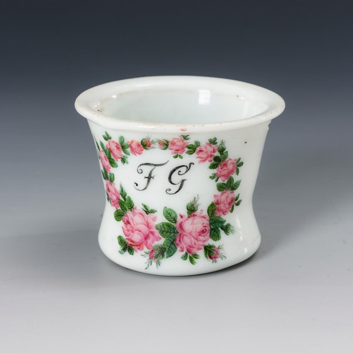Kraternäpfchen mit zwei eingeschliffenen Öffnungen für die Fadenaufhängung, Abriss. Mit dem Monogramm "FG" in einem Rosenkranz, verso ein Blumenbukett.