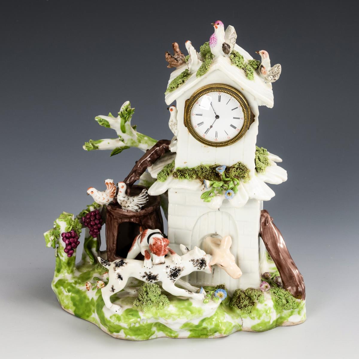 Als kleines Häuschen gestaltetes Uhrengehäuse mit Schwein, Hunden und Tauben. Uhr läuft nicht. Einige Blätter und Blüten bestoßen, 2 Tauben, 1 Hundebein und -schwanz restauriert.