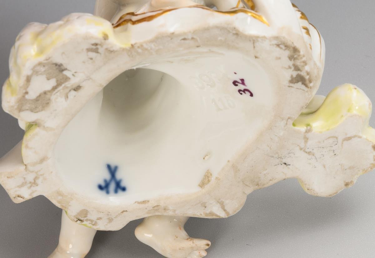 Eine Rocaille mit Spargel und Blumenkohl umfassender Putto. Minimale Bestoßung am Stand.