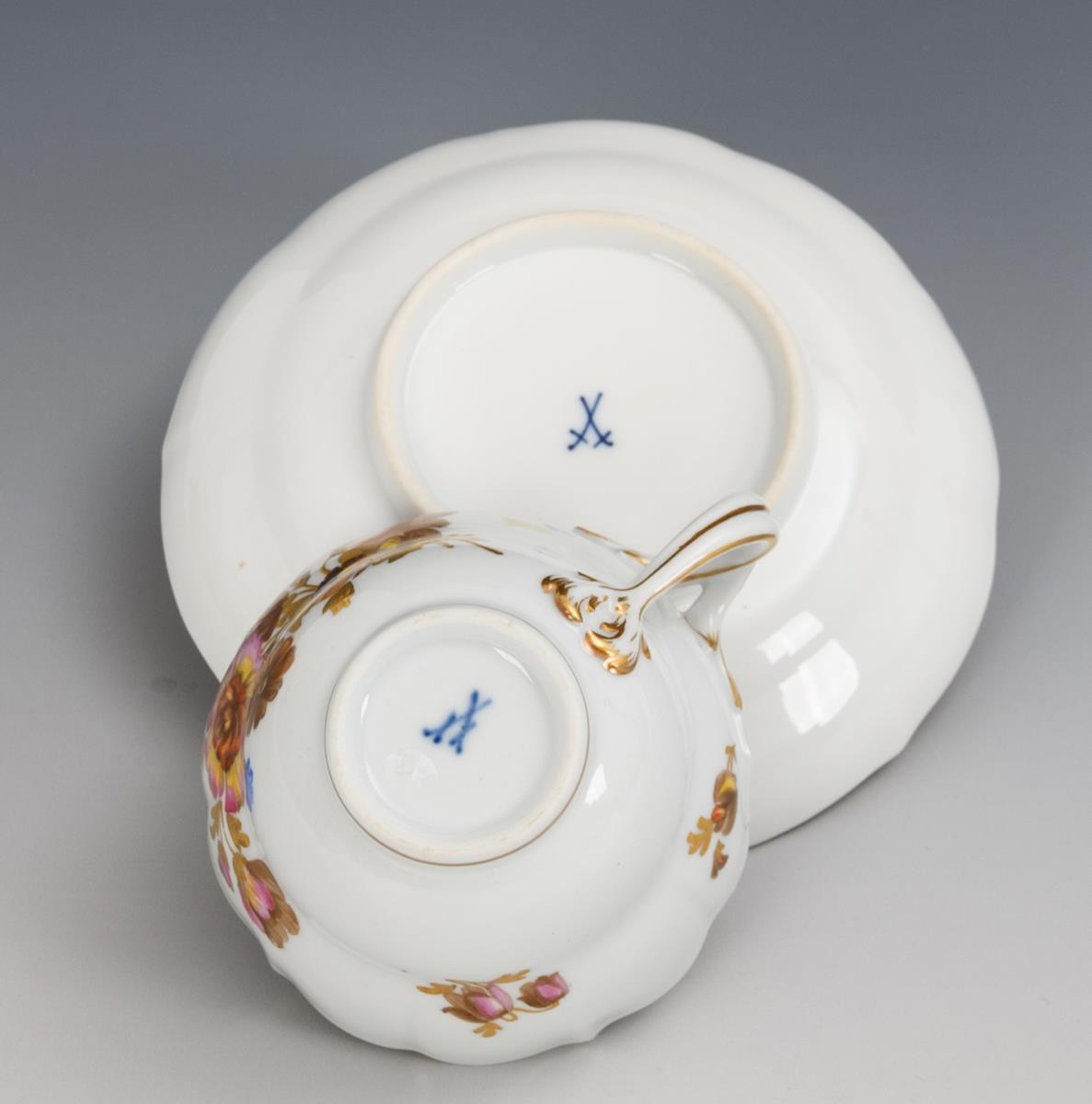 Form "Neuer Ausschnitt". Schauseitig und im Spiegel der Untertasse ein Blumenbukett in Braun- und polychromen Farbtönen sowie mit goldradiertem Blattwerk. Partieller Goldabrieb.