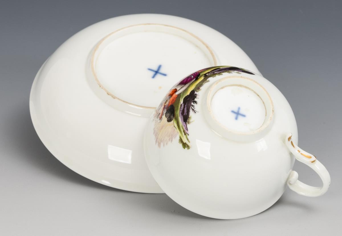 Polychrom bemalt, goldstaffiert. Tasse (H 5 cm), originale Untertasse (Ø 13 cm).