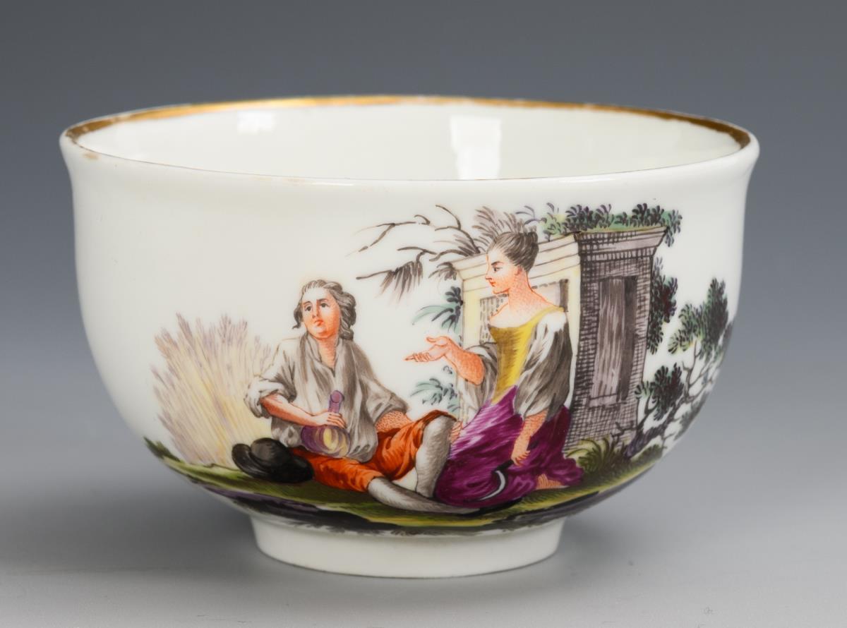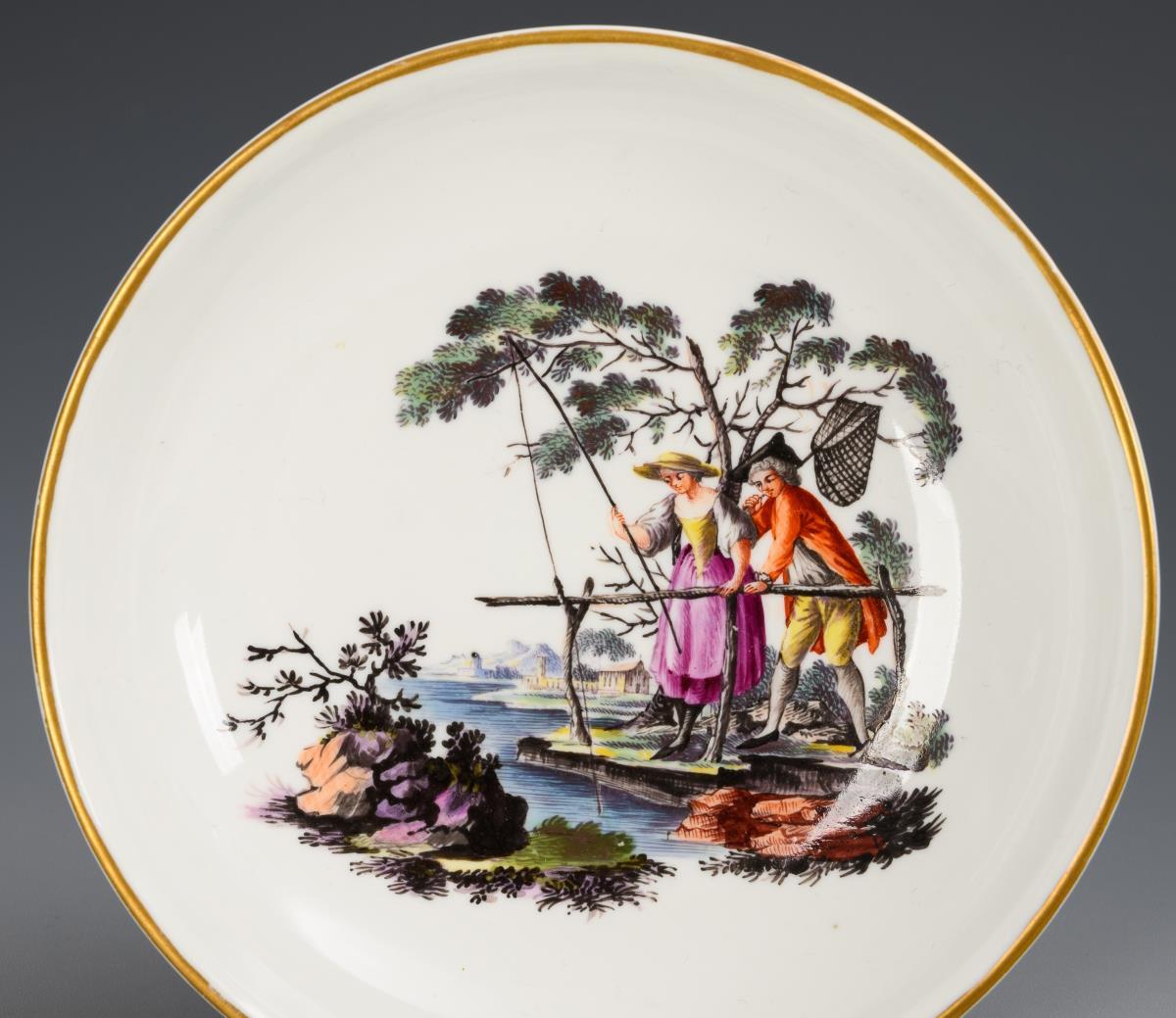 Bauchige Tasse mit Rocaillehenkel. Schauseitig auf der Tasse die Darstellung eines Bauernpaares in einer Landschaft, im Spiegel der Untertasse die Darstellung eines Fischerpaares am Flussufer. Minimaler Goldabrieb am Tassenrand.