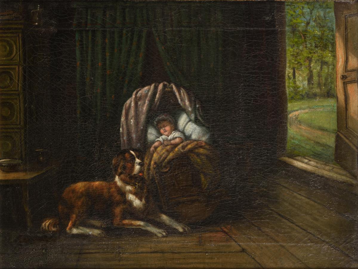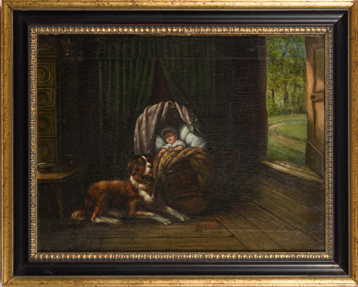 Undeutlich signiert: Baby in der Wiege mit wachsamem Hund