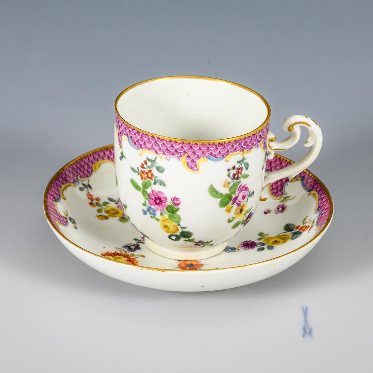 Polychrom bemalt, goldstaffiert. Tasse (H 7 cm), originale Untertasse (Ø 13,5 cm).