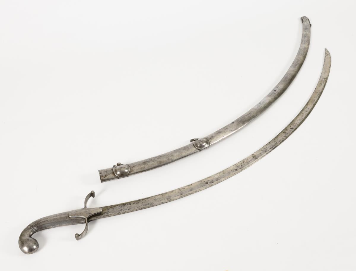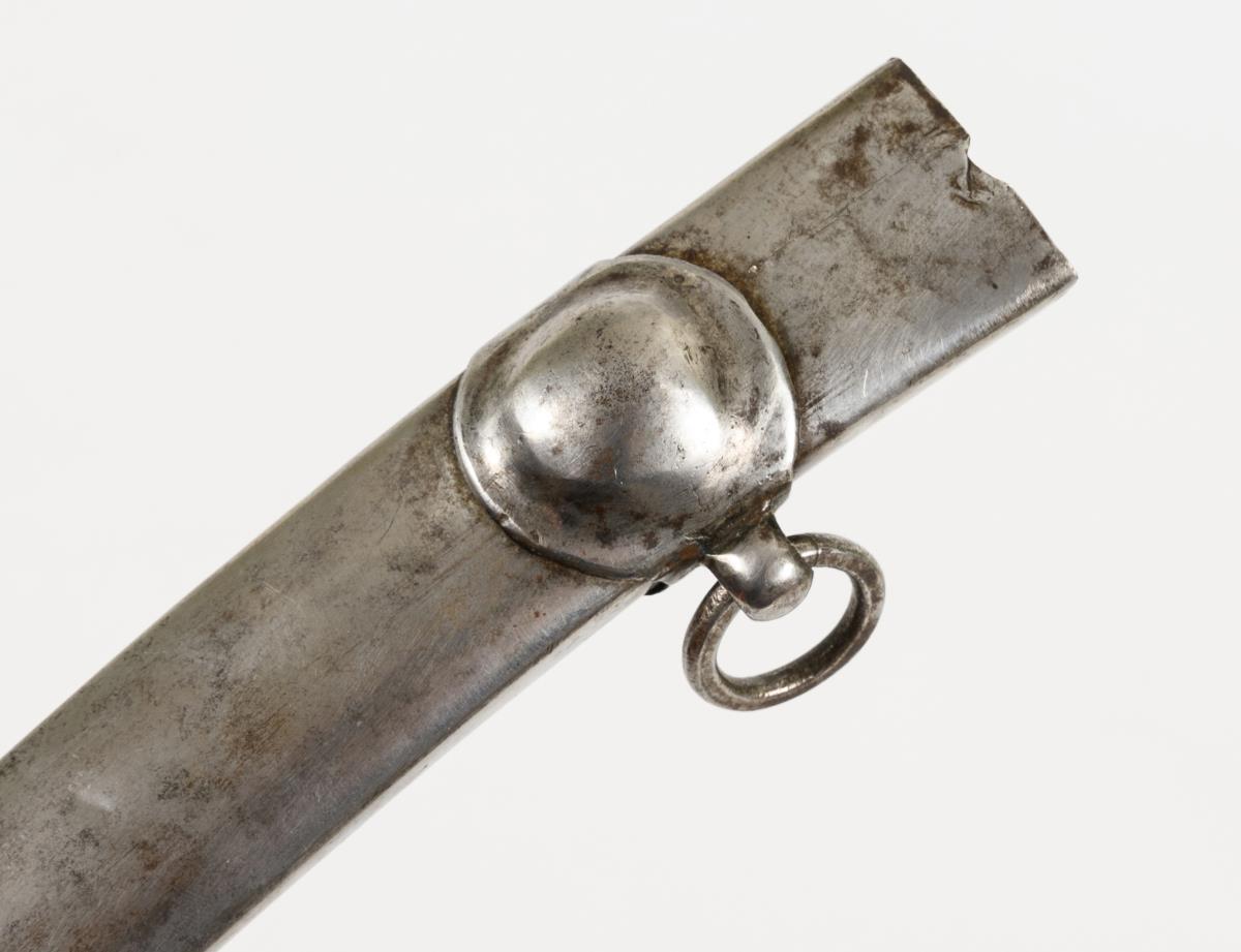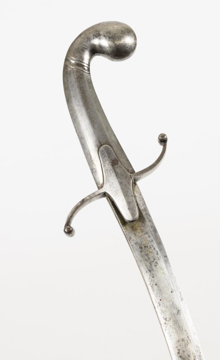 Einschneidige, stark gekrümmte Klinge mit Spitze in der Rückenlinie. Eisengriff mit s-förmiger Parierstange. Eisenscheide mit zwei Ringen.