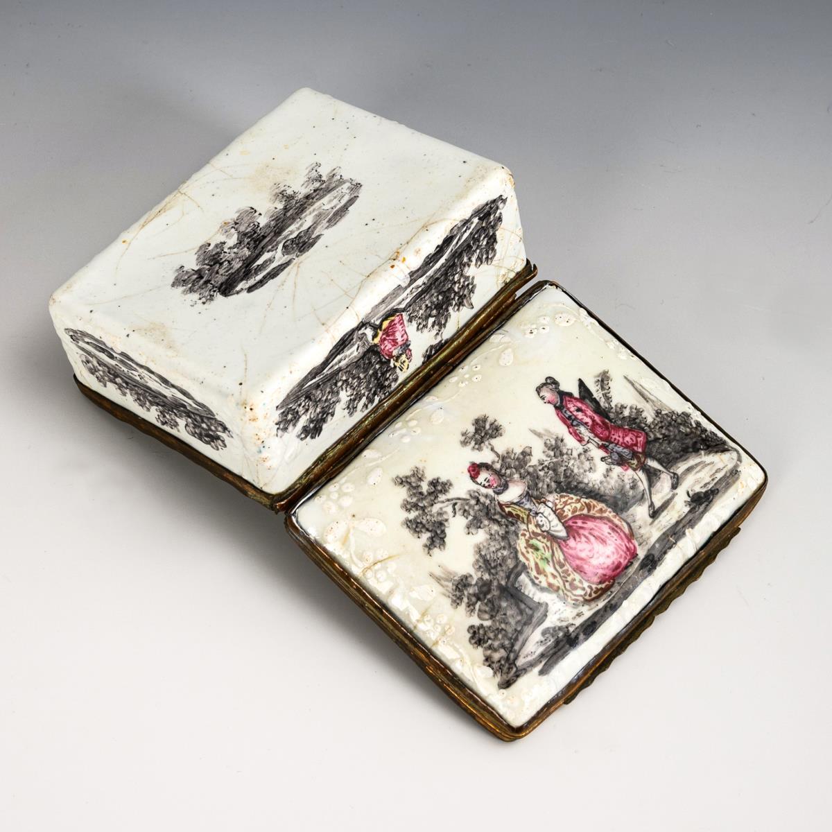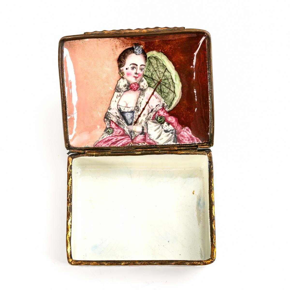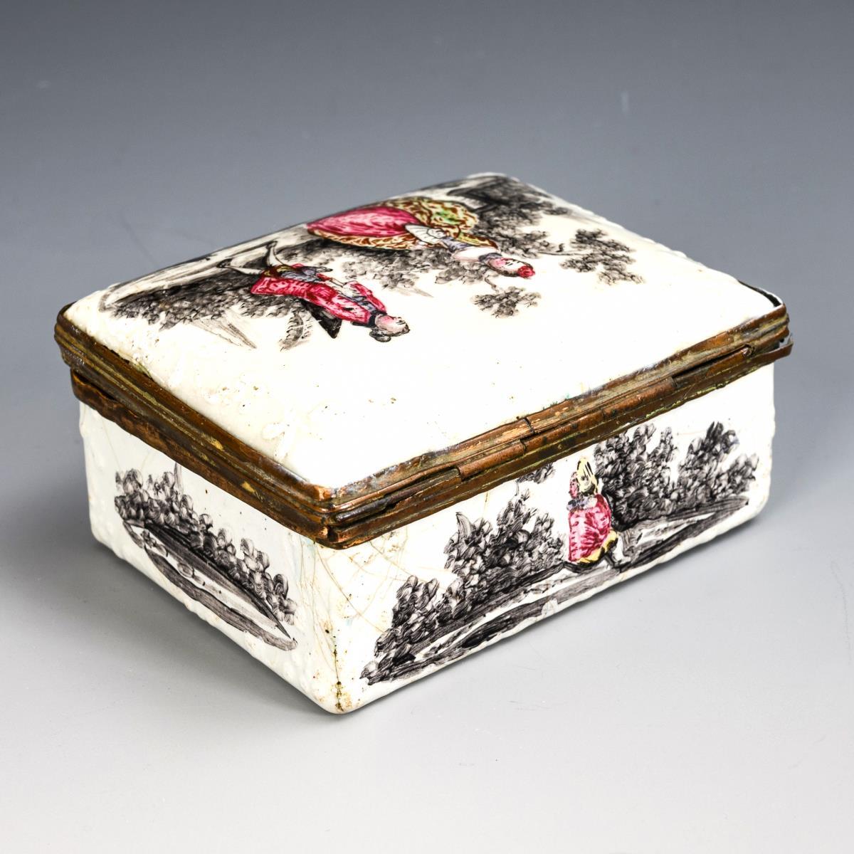 Quaderkorpus mit bombiertem Scharnierdeckel und verzierter Montierung. Allseits, auch auf dem Boden Grisaille-Landschaften, teils mit farbig gestalteten Personen. Auf dem Deckel ein galantes Paar; im Deckel Porträt einer jungen Dame mit Sonnenschirm. Haarrisse, einige wenige Alters-/Gebrauchsspuren, Porträthintergrund teils retuschiert.
