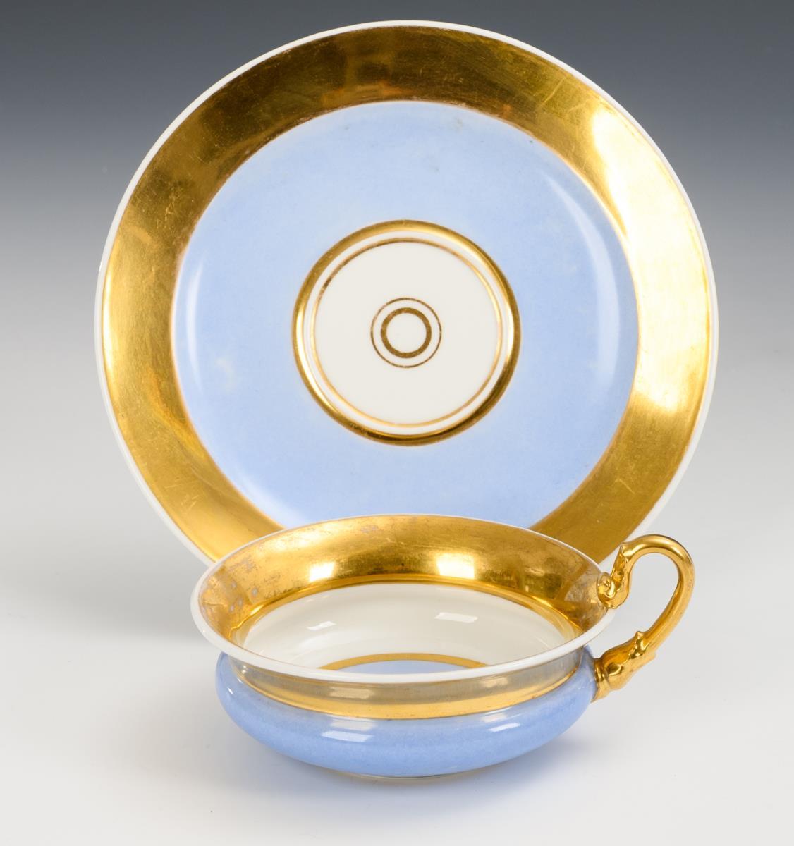 Polychrom bemalt, goldstaffiert. Tasse (H 5,5 cm), originale Untertasse (Ø 16 cm).