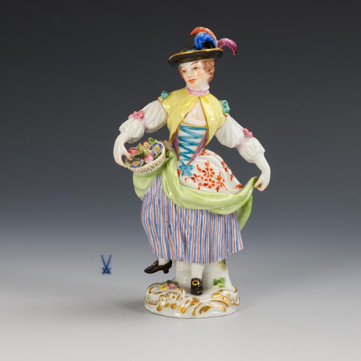 Auf einem Rocaillesockel stehendes Mädchen mit Blumenkorb.