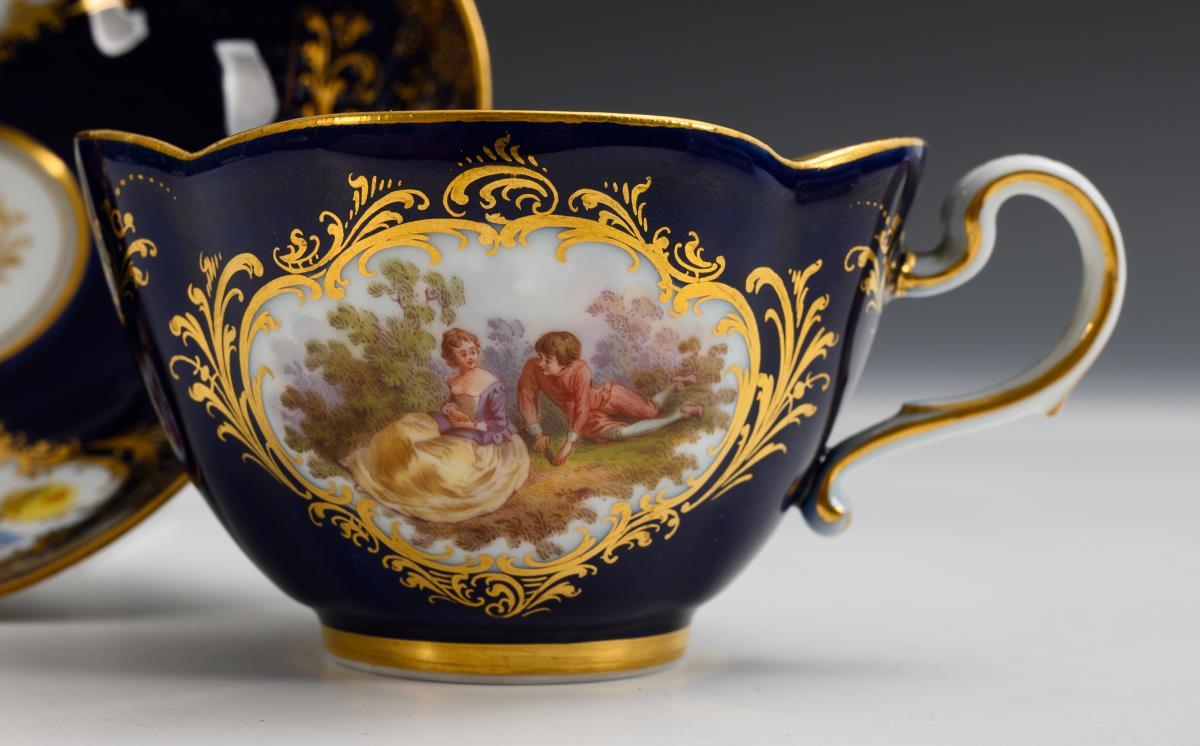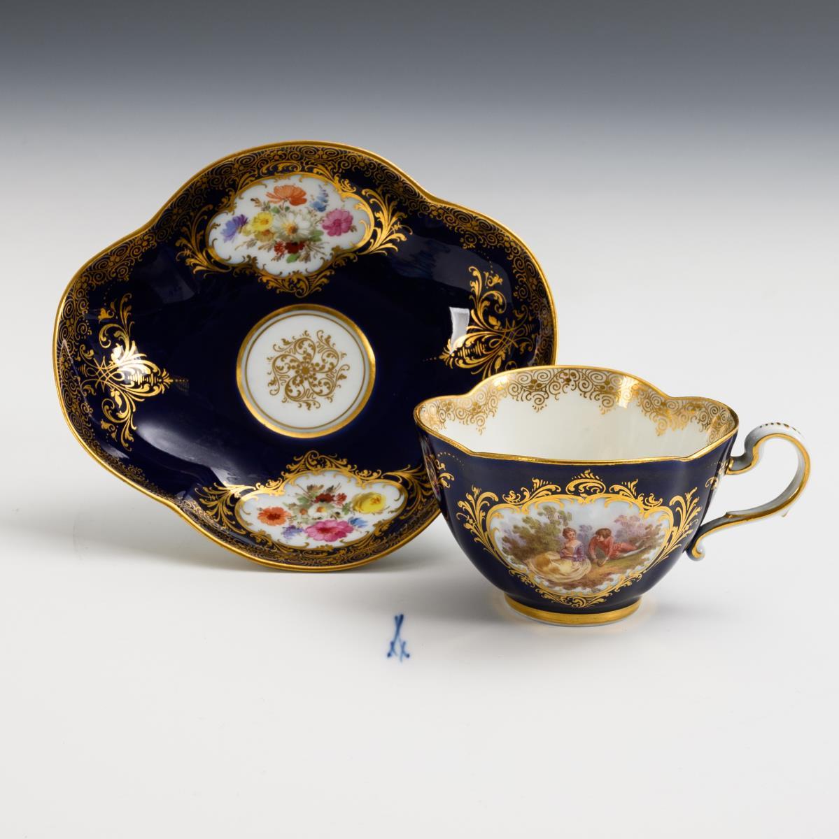 Kobaltfond mit reicher floral-ornamentaler Goldmalerei, schauseitig auf der Tasse eine Vierpasskartusche mit der Darstellung einer galanten Szene, verso ein Blumenbukett.