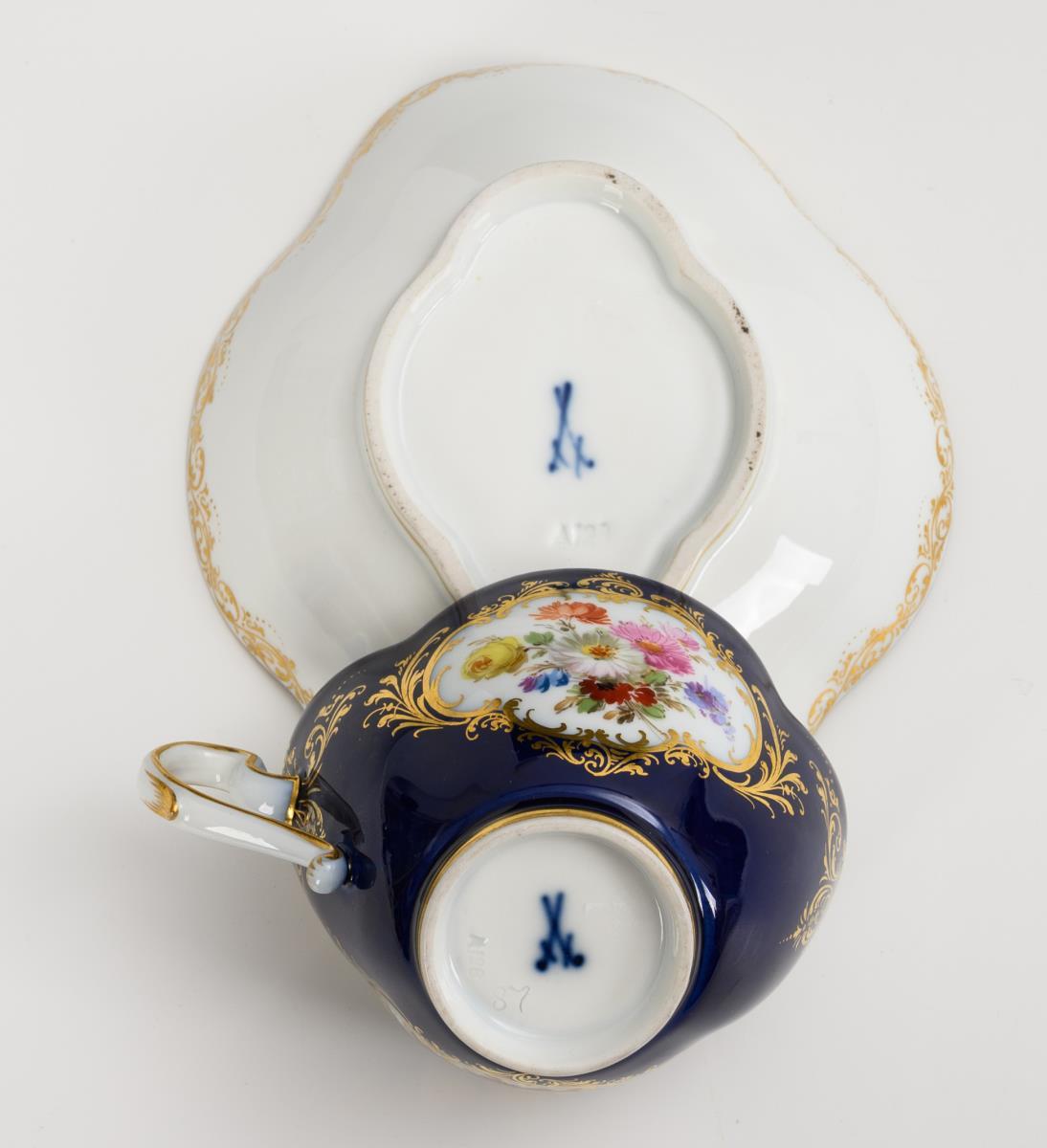 Kobaltblauer Fond, polychrome Malerei, Goldstaffage. Tasse (H 5 cm), originale Untertasse (L 13,5 cm).