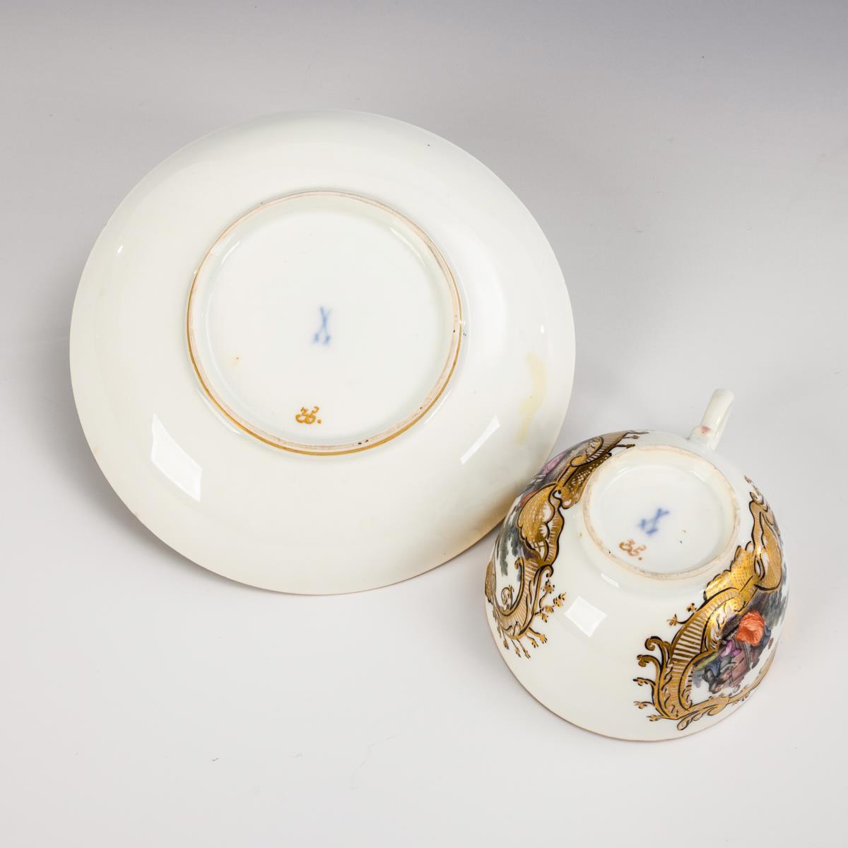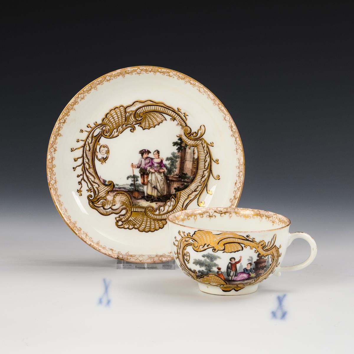 Bauchige Tasse mit Ohrenhenkel. Auf Tasse und Untertasse die Darstellung von galanten Szenen in Rocaillekartuschen. Gold etwas berieben.