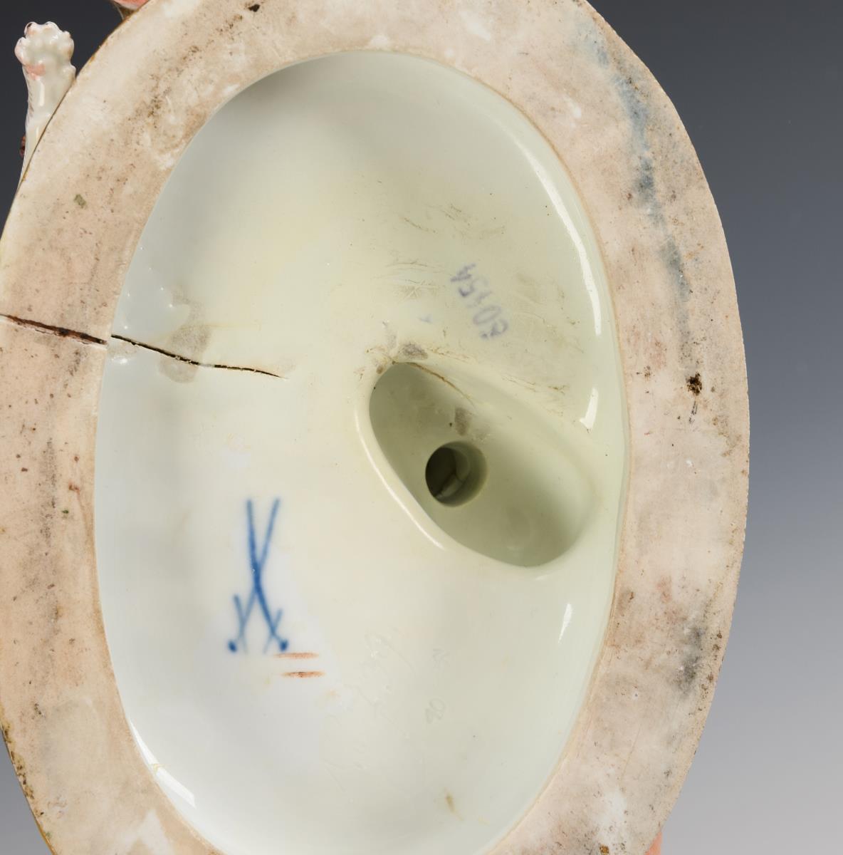 Plastik eines von zwei Hunden angegriffenen Keilers. Brandriss im Sockel, Brandriss in 1 Hundebein, Sockel und Keilerschwanz restauriert, Keilerzunge und rechtes Hinterbein des Keilers minimal bestoßen, 1 Ast fehlt, Blätter des Baumes bestoßen.