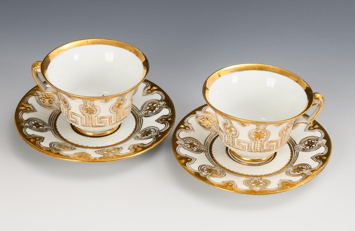 Weiß mit Goldstaffage. 2 Tassen (H 6,5 cm), 2 Untertassen (Ø 15,5 cm).