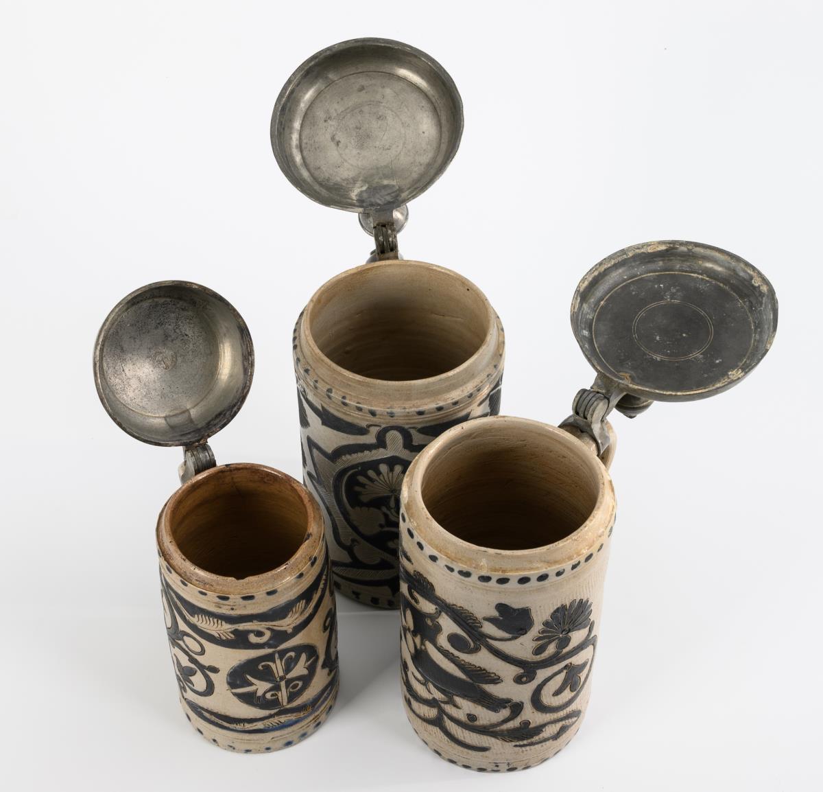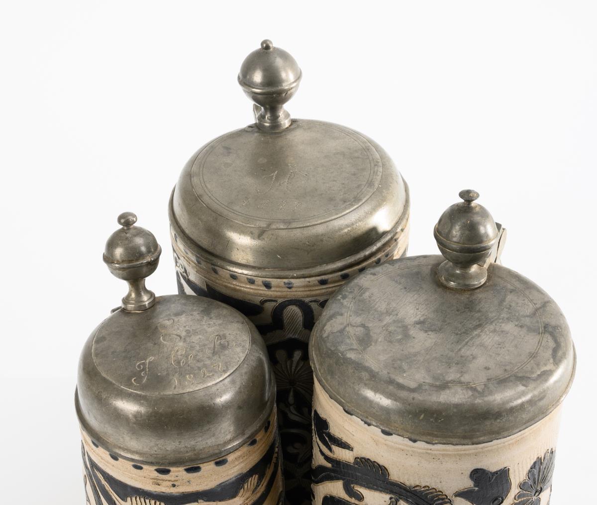 Zylinderkrüge mit Ohrenhenkeln, 1x Vogel und Blumenranken, 2x Blumenkartuschen und Rankendekor. Jeweils mit Zinndeckel, Kugeldrücker und Gravuren. Alters- und Gebrauchsspuren, partiell leicht bestoßen und rissig, 1 Deckel nicht passend ergänzt.