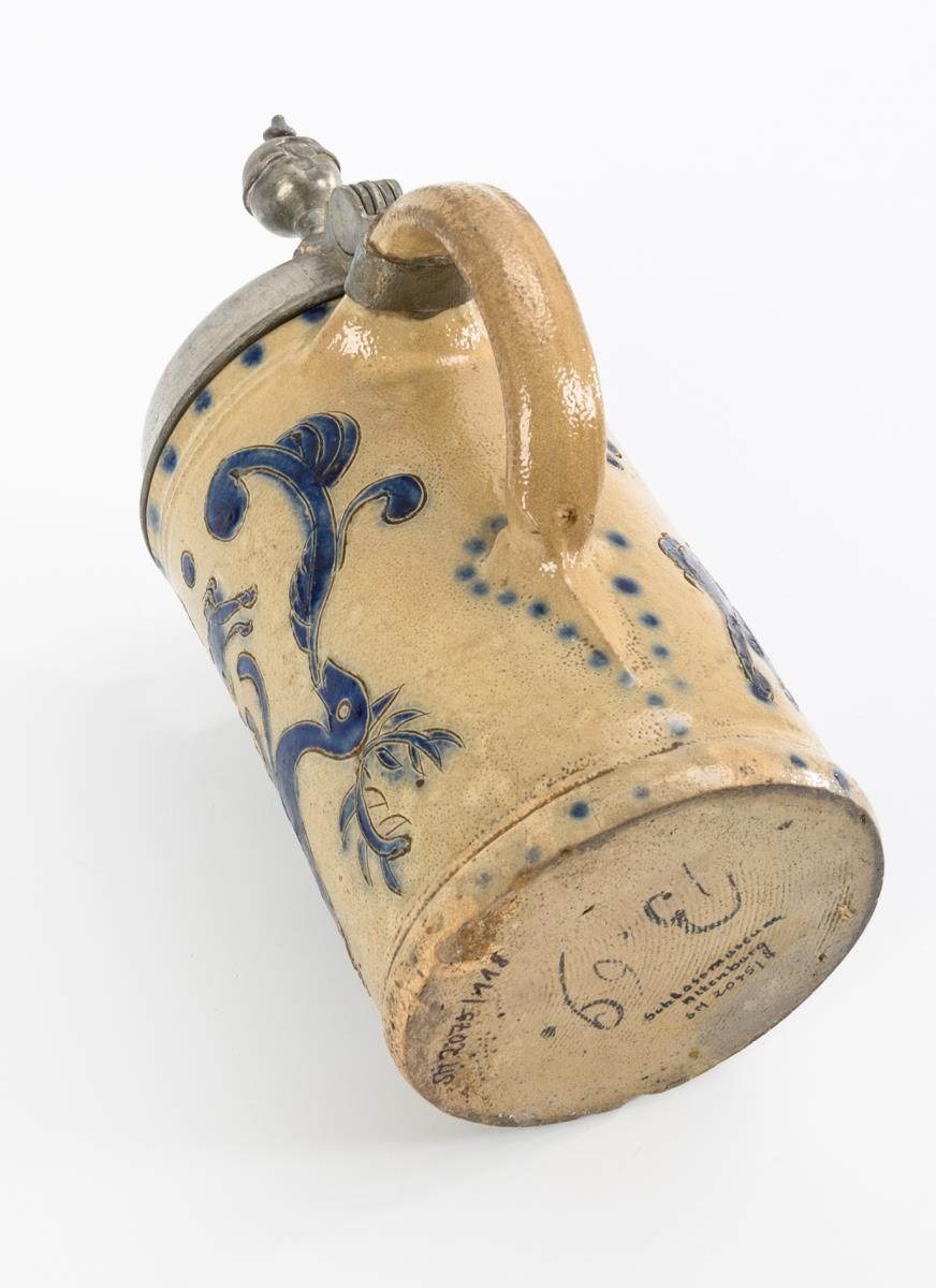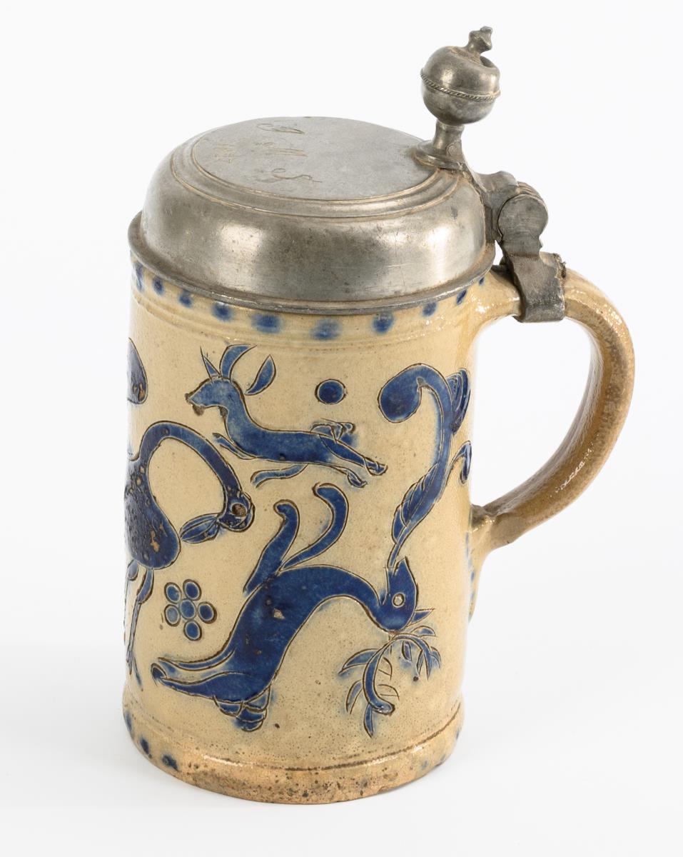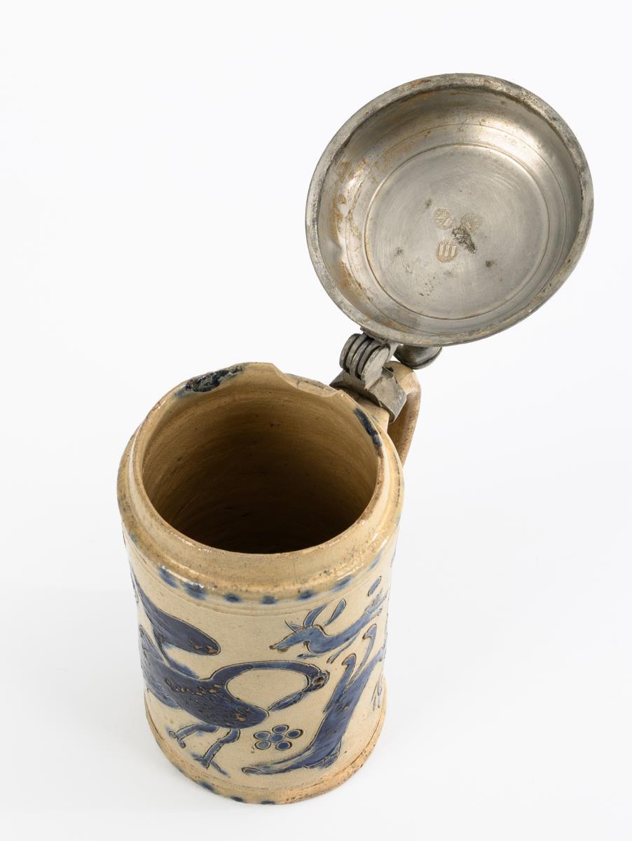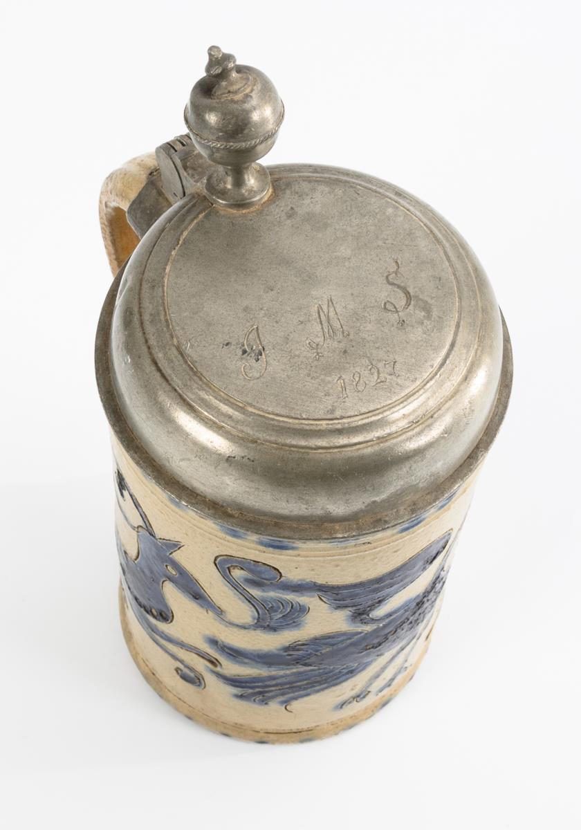 Zylinderform mit spitz auslaufendem Ohrenhenkel. Zinndeckel mit Kugeldrücker, graviert "JMS" und datiert "1827", innen gepunzt und mit Leinenfleck. Leichte Altersspuren, partiell bestoßen und glasurberieben, Ausbruch und Haarriss am Rand, Zinn mit Defekten.