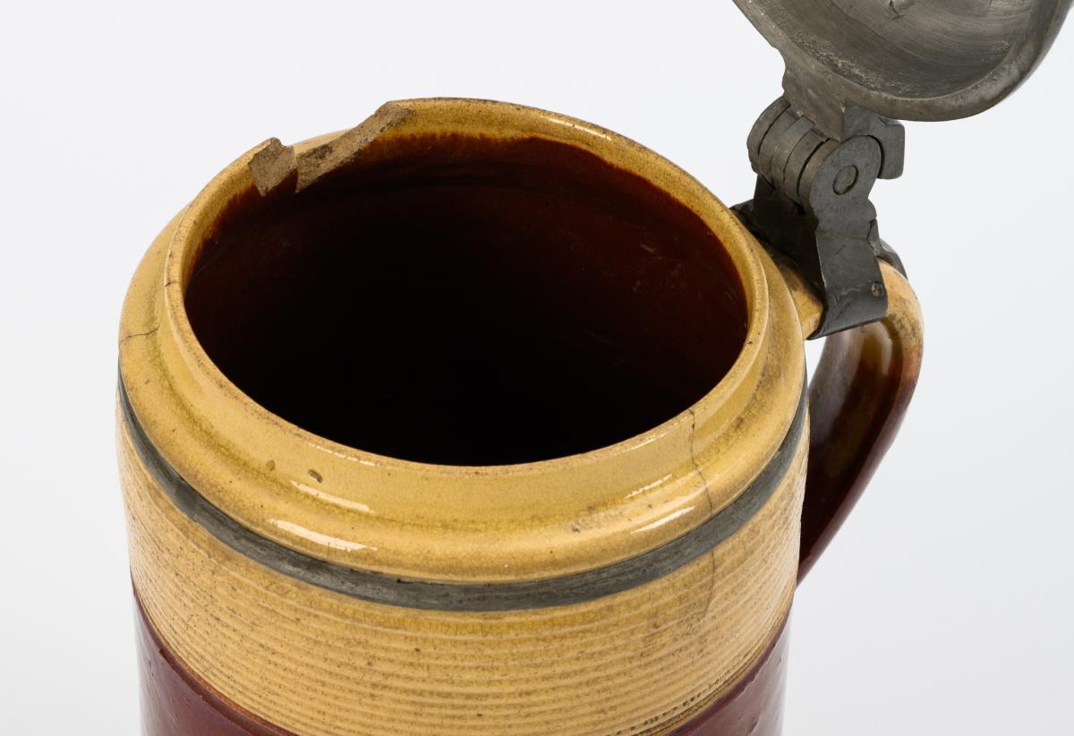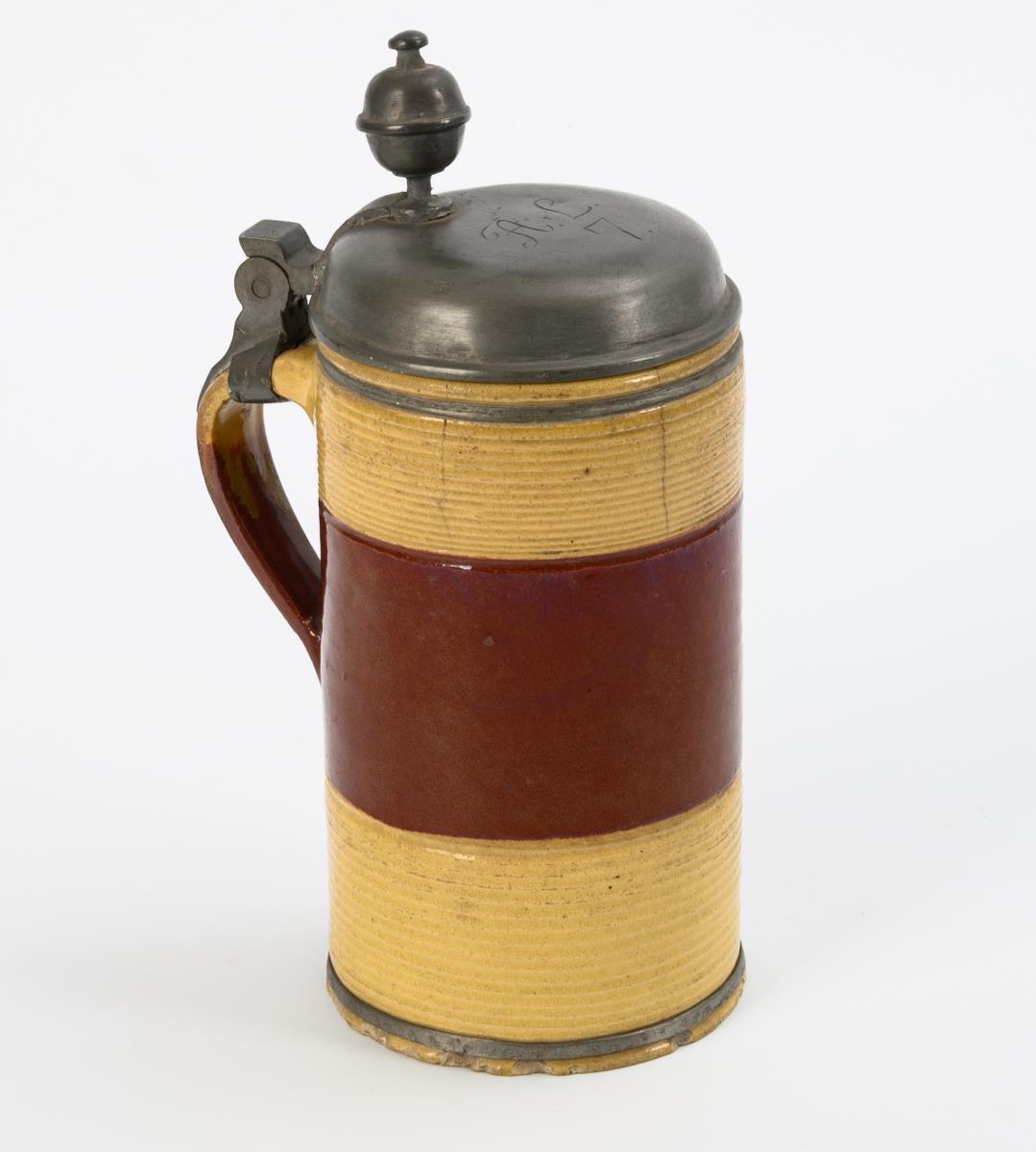 Zylindergefäß mit Parallelrillen im oberen und unteren Bereich, zweifarbiger Bandhenkel. Gewölbter Zinndeckel mit Kugeldrücker, graviert "AL 7", innen gepunzt, Zinnbänder. 3 feine Mündungsrisse und 1 Ausbruch, Standkante bestoßen.