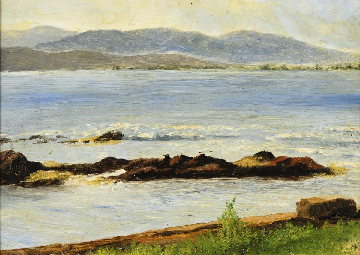 Felsige Küste mit bergigem Land unter bedecktem Himmel sowie Blick übers Wasser zu den Bergen am anderen Ufer. Je minimale Altersspuren.