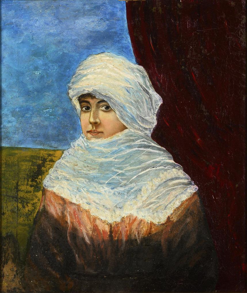 Bildnis einer Frau mit weißem Tuch um den Kopf vor karger Landschaft mit blauem Himmel. Eine kleine restaurierte Stelle mit Hinterklebung, retuschiert.
