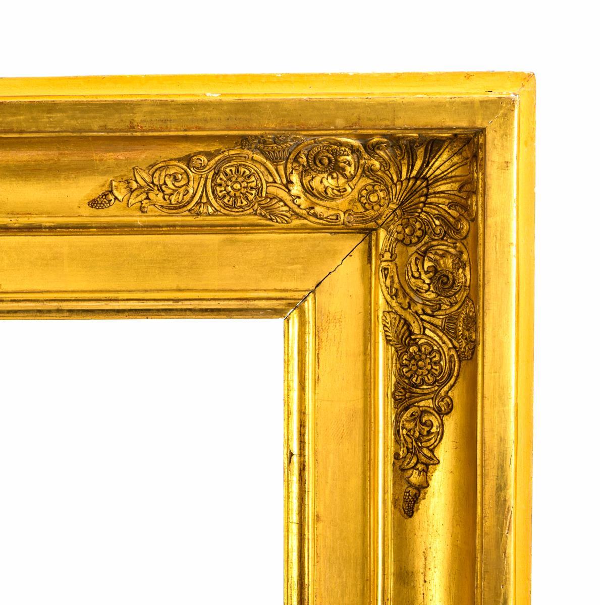 Holz polimentvergoldet, Außenseiten gelb gefasst, Eckornamente aus Stuck. Lichtes Maß 98 x 74,5 cm, Falzmaß 101 (ursprünglich 105) x 78,5 cm, Außenmaß 127 x 101 cm. 12,9 kg.