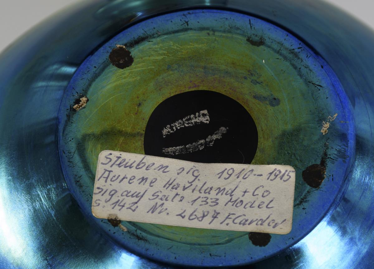 3x "Myra WMF", um 1930, bernsteinfarbenes, irisiertes Glas: Kraterschale (H 5,5 cm), Schälchen mit drei Kugelfüßen (H 3 cm), Kelchglas (H 10 cm). / 1x Steuben "Aurene", signiert, um 1915: bauchige Vase aus farblosem Glas mit vom Stand her koblatblau verlaufendem Innenfang, irisiert (H 8 cm). 1x mit Randchip.