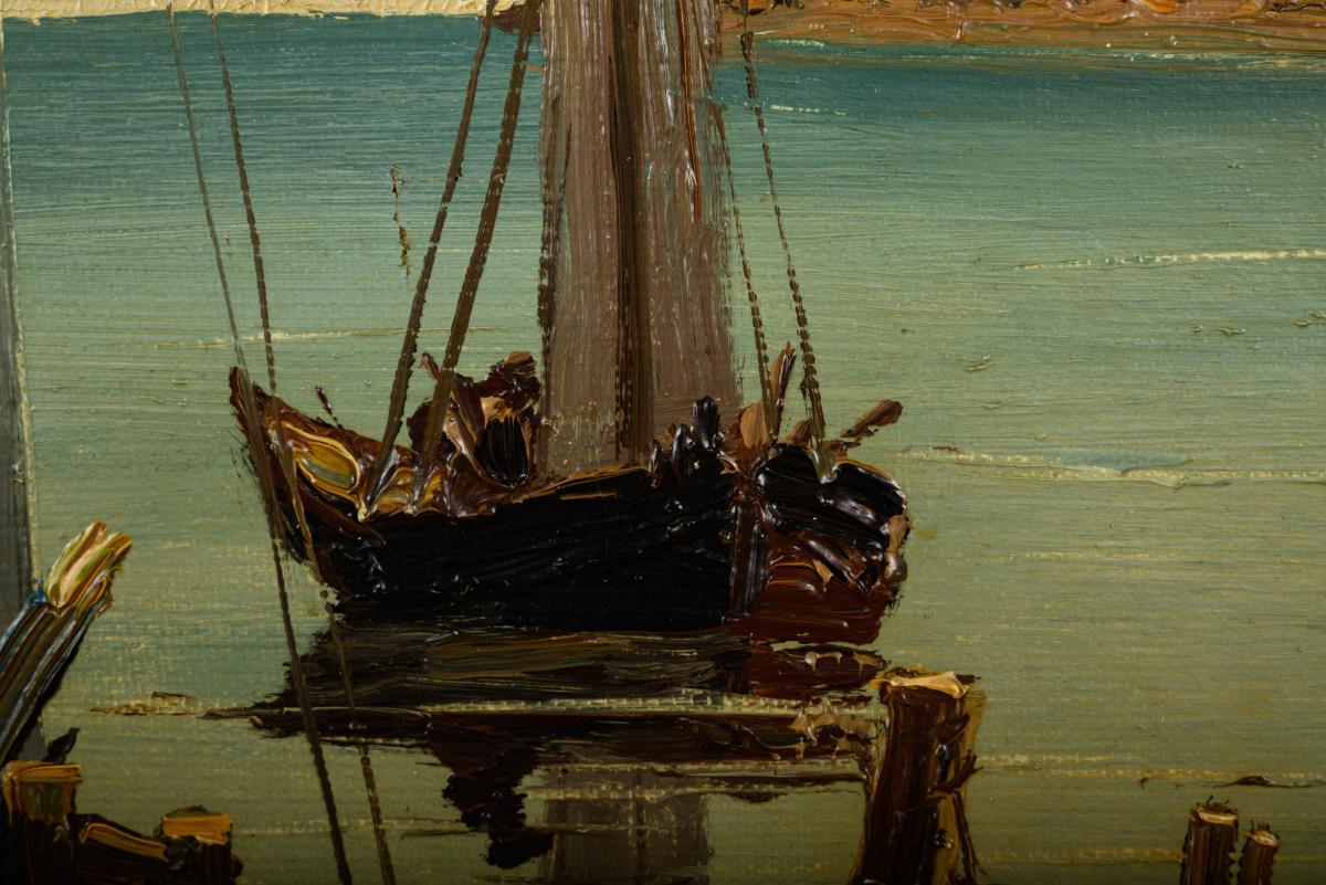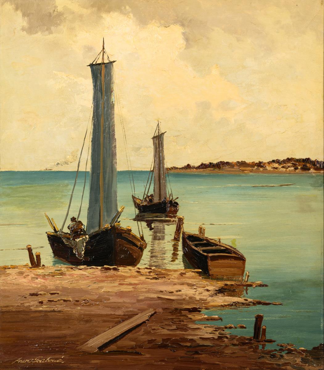 Drei Boote auf dem ruhigen Wasser nahe dem Strand. Leinwand doubliert.