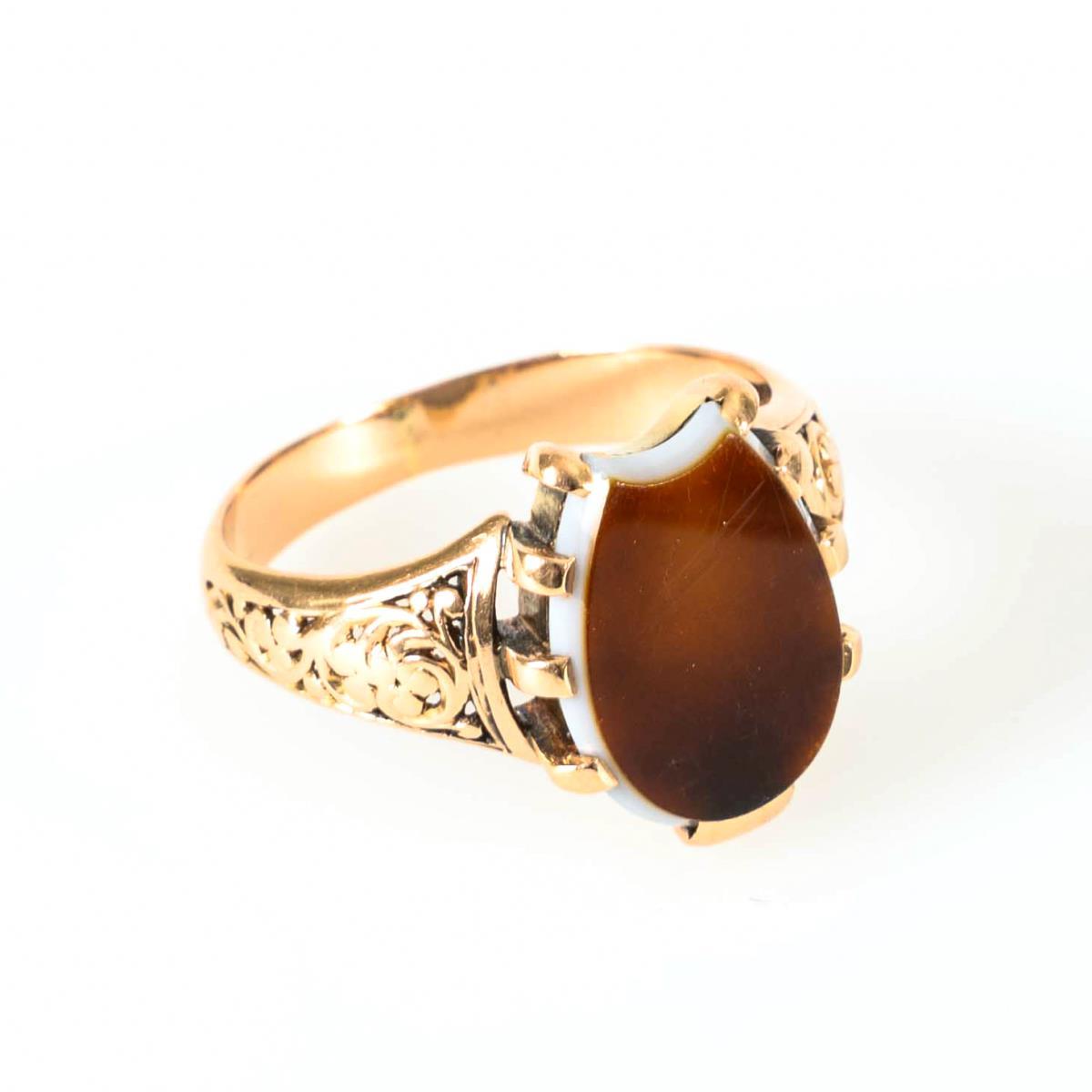 Krappengefasster, hufeisenförmiger Achat zwischen durchbrochener Schulter und mittlerer Schiene.