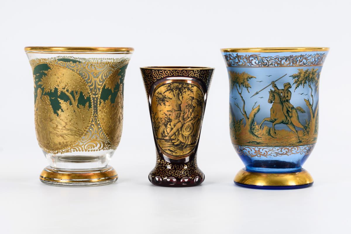 Farbloses, hellblaues bzw. farbloses Glas mit rotem Überfang. Reiche Goldmalerei. H 15-17,5 cm.
