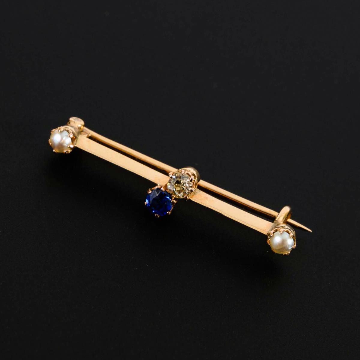 Kleine Brosche mit Saphir und Altschliffdiamant, um 1900.