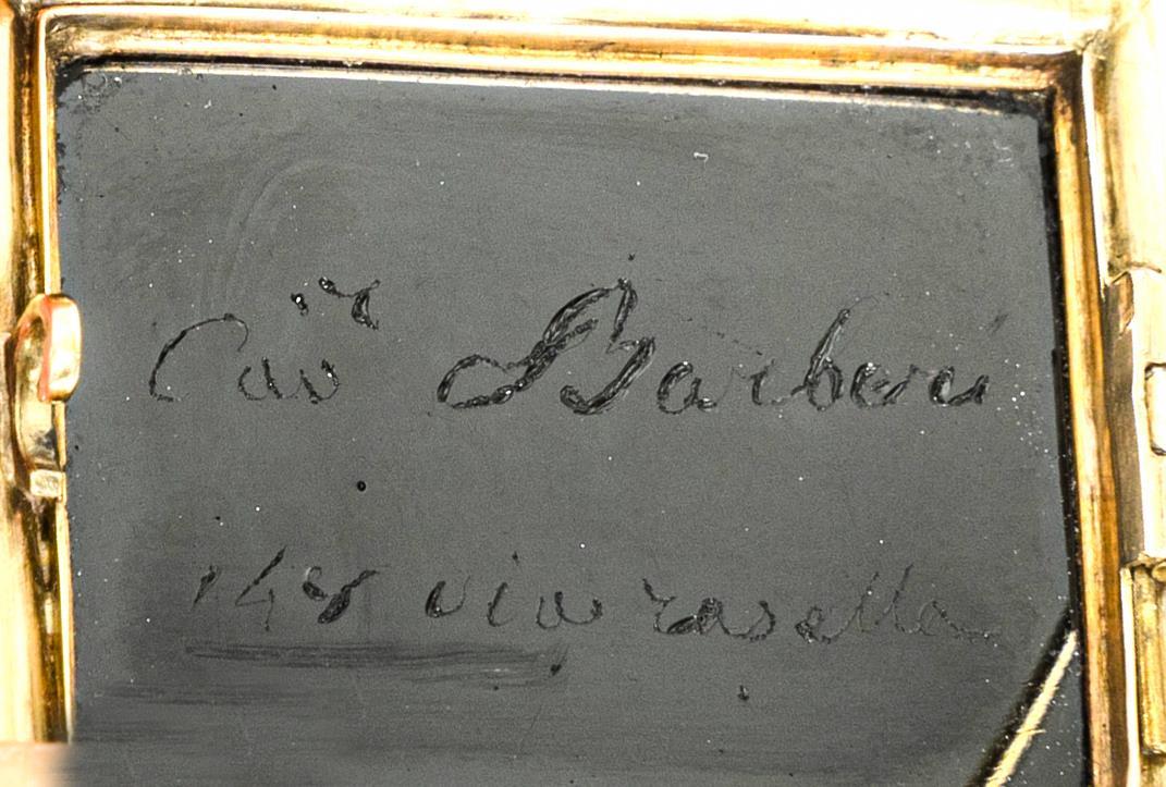 Zargengefasste Tafel mit eingelegtem Mosaik eines Vogelpaares. Rückseitig graviert "Cav Baberu 148 Via Casella". Hakenverschluss.