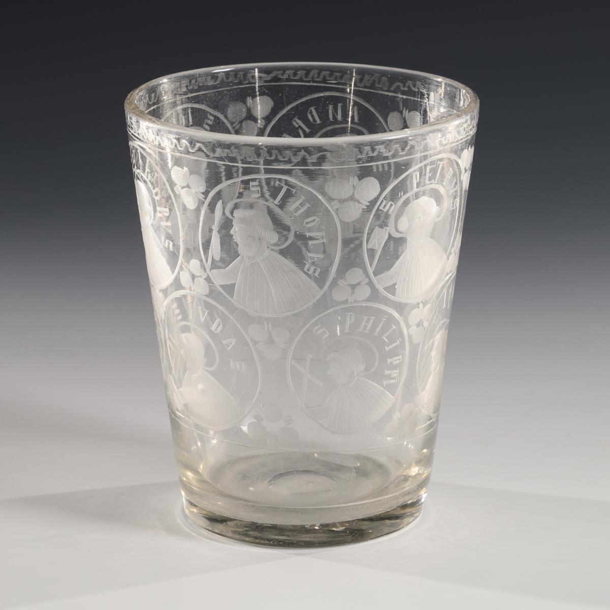 Konischer Becher, auf der Wandung zwölf Kartuschen mit den gravierten Darstellungen der zwölf Apostel mit Attributen und Bezeichnungen; Abriss.