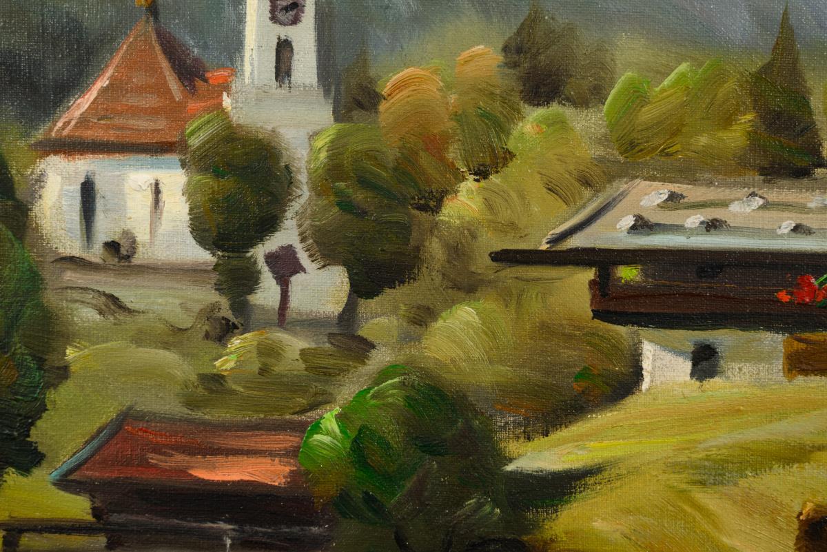 Die kleine Ortschaft im Sonnenschein vor den steil aufragenden Bergen.