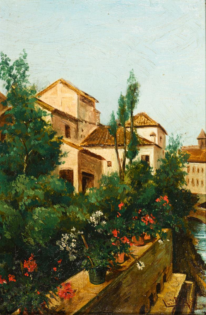Balkon mit Topfpflanzen in mediterraner Stadt oberhalb eines Flusses.