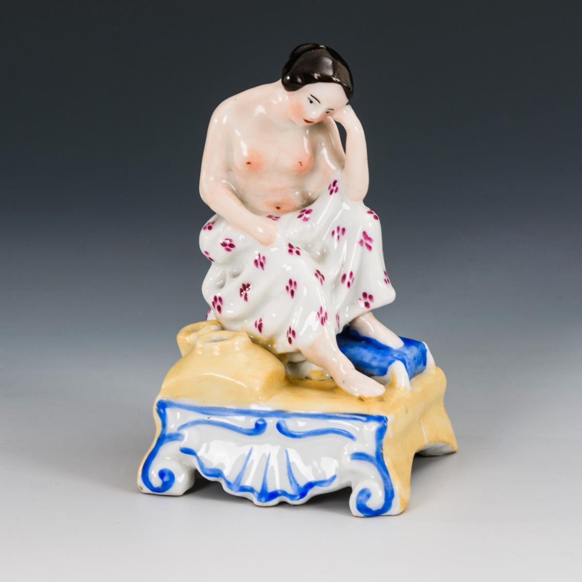 In nachdenklicher Pose sitzende junge Frau mit nacktem Oberkörper, auf rechteckigem Sockel. 1 Brandriss im Sockel.