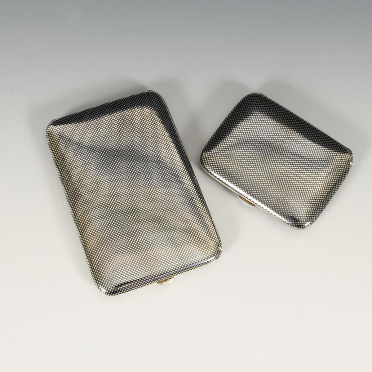 2 rechteckige Silberetuis mit Karomuster in Niello-Technik verziert. Das kleinere mit Monogrammgravur "ER" innen. Gebrauchsspuren, Dellen.