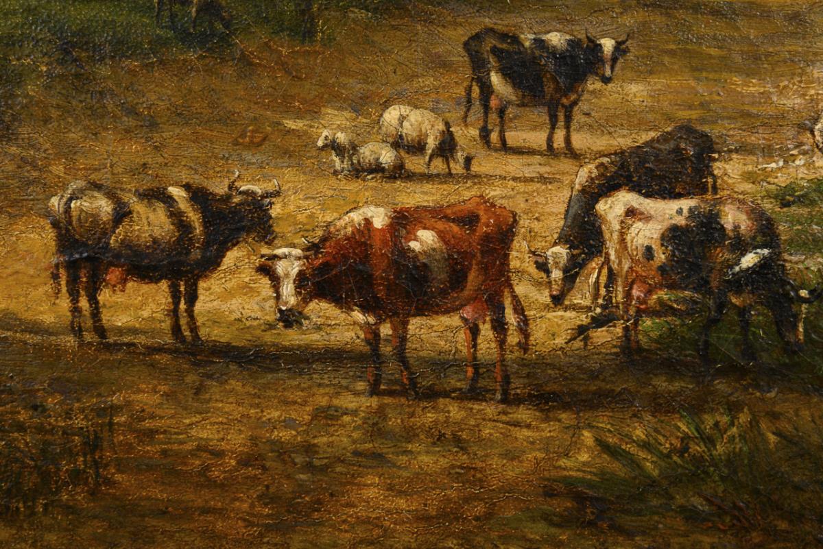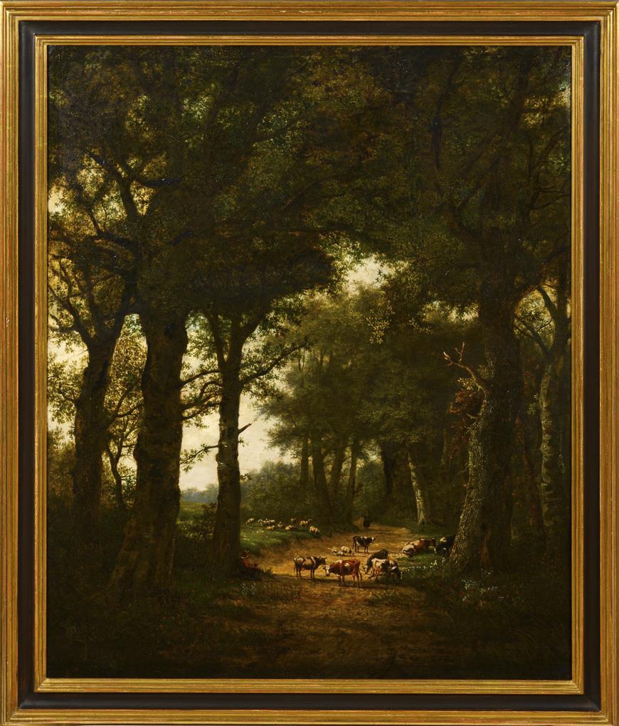 Rastender Hirte mit Kühen und Schafen auf einer Straße am Waldrand mit nahender Magd. Leinwand doubliert.