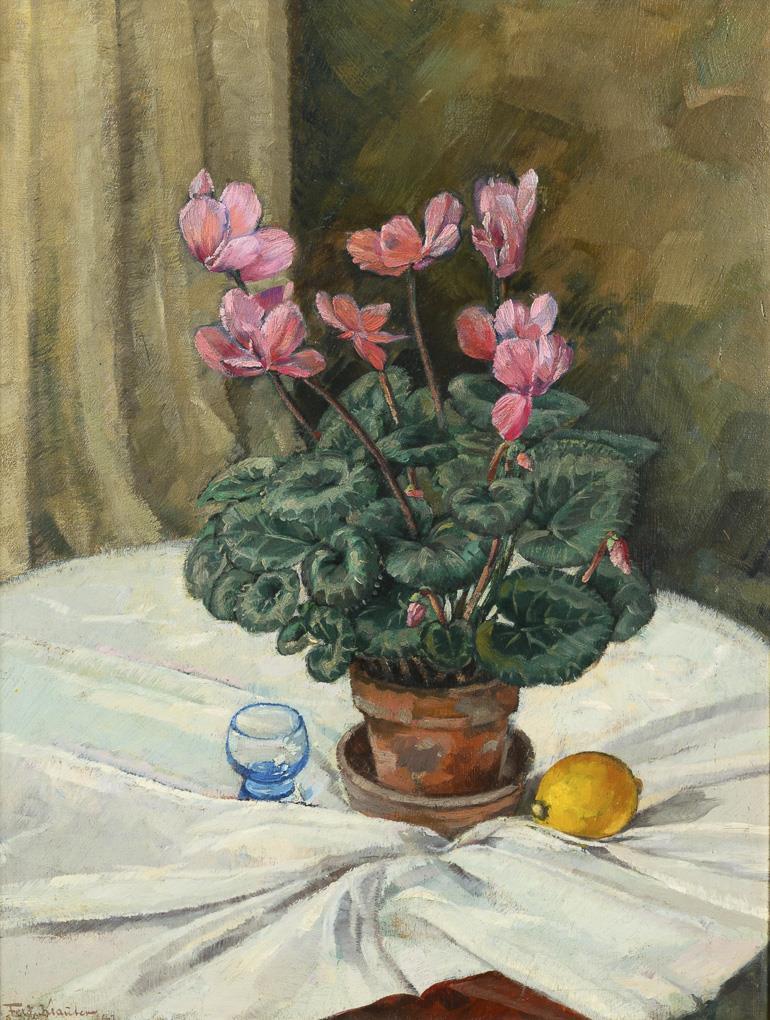 Die Blumen in einem Topf neben Glas und Zitrone.