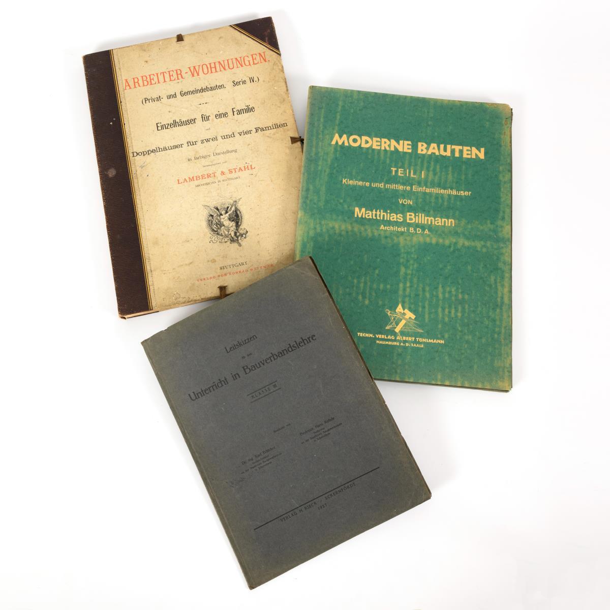 Lambert & Stahl: "Arbeiter-Wohnungen (Privat- und Gemeindebauten. Serie IV.) Einzelhäuser für eine Familie und Doppelhäuser für zwei und vier Familien, in farbiger Darstellung", Stuttgart ohne Jahr. Mit 60 Tafeln in Mappe. / Böttcher; Rohde: "Leitskizzen für den Unterricht in Bauverbandslehre, Klasse III", Eckernförde 1927, 13 Blätter. / Billmann: "Moderne Bauten Teil I, kleinere und mittlere Einfamilienhäuser", Naumburg. 32 Tafeln in Mappe.