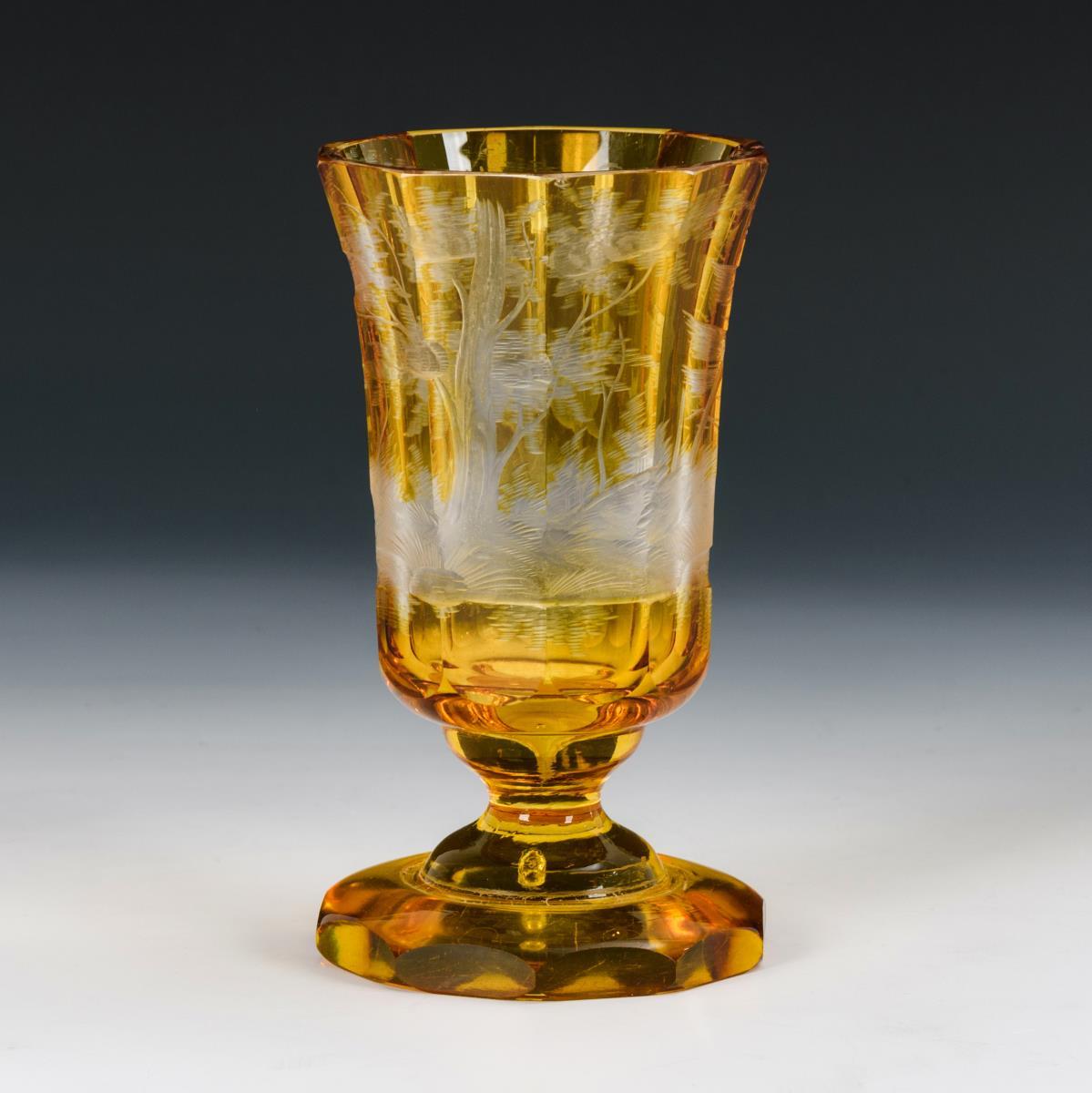 Gefußter Kraterbecher mit facettierter Kuppa. Umlaufend die Darstellung einer Waldlandschaft mit Hirsch und Reh. 1 Randbestoßung, Kratzspuren.