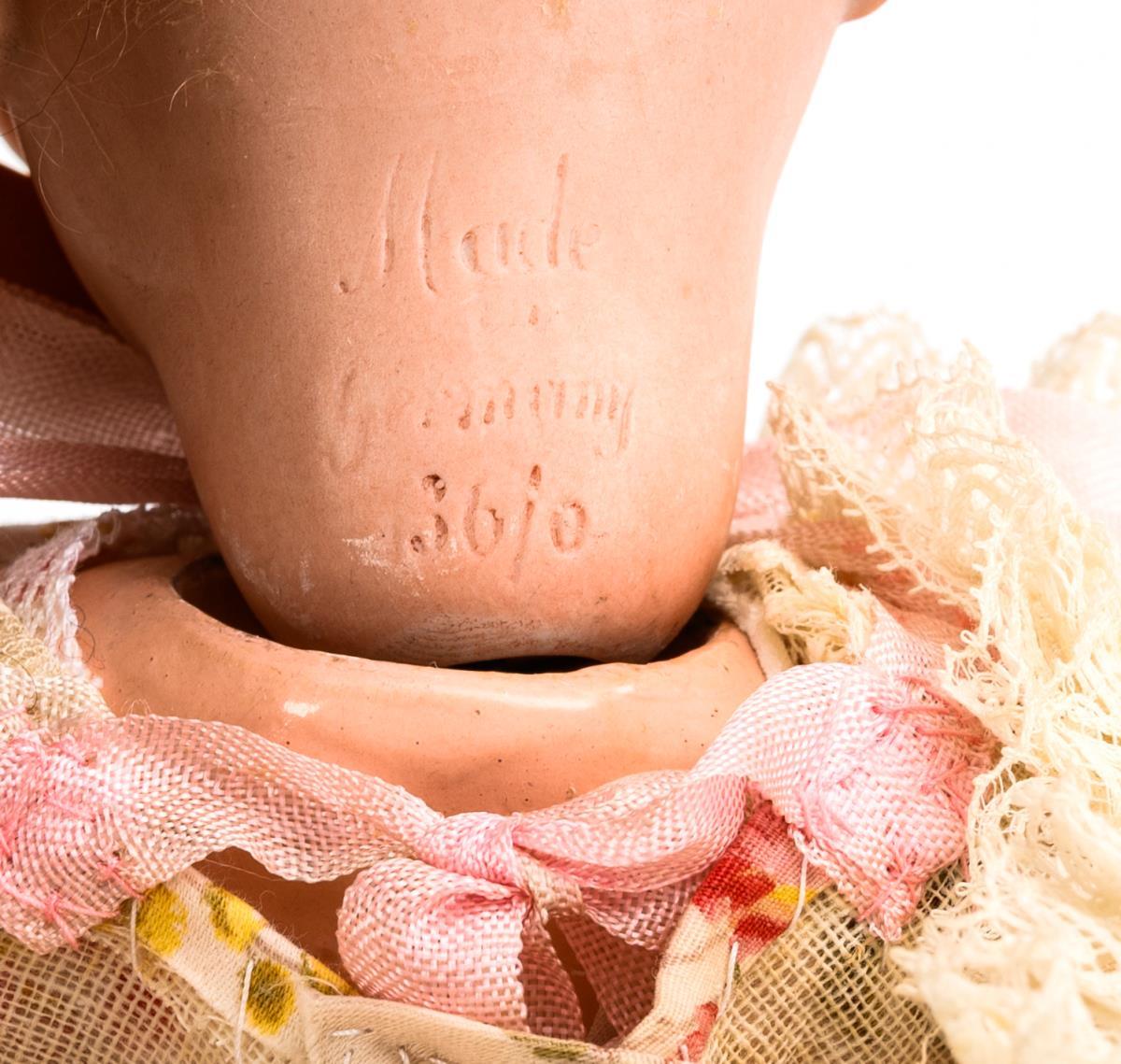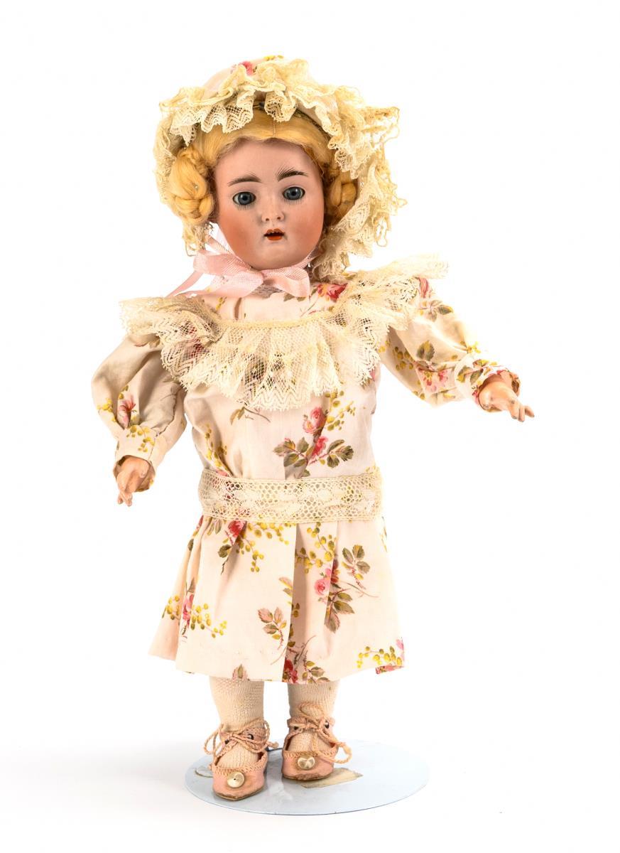 Kurbelkopf, blaue Schlafaugen, blonde Mohairperücke. 15-teiliger Gliederkörper. Geblümtes Kleid, passendes Häubchen in alter Art, rosa Schuhe. Kopf durchleuchtet: ohne Defekte.