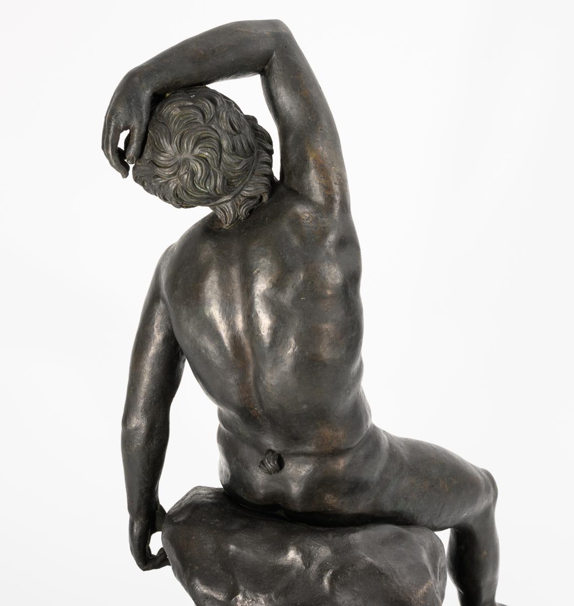 Auf einem Felsen sitzender Faun bzw. Satyr im antiken Schlafgestus. Nach der lebensgroßen antiken Bronzefigur im Archäologischen Nationalmuseum von Neapel, die aus der Villa dei Papiri in Herculaneum stammt. Kleinere Gussfehler und Reparaturen wohl von der Gießerei, eventuell jünger patiniert.