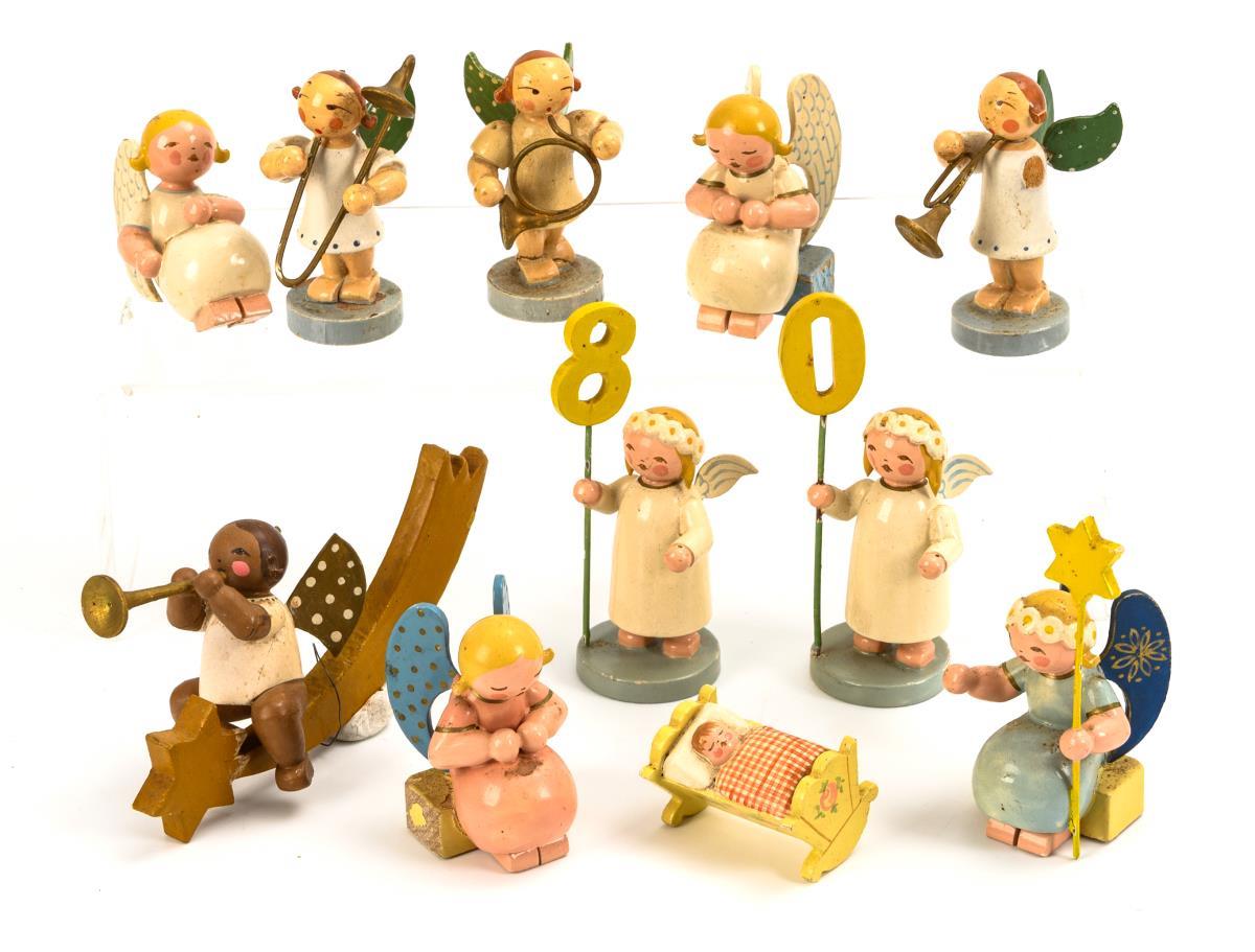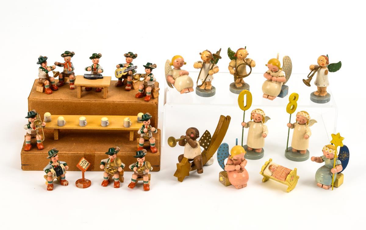 10 Engelchen und 1 Baby in Wiege (6x gemarkt "Wendt & Kühn"), H 2,5 - 8,5 cm. / 9 musizierende Figürchen ("EHO Kunst" gemarkt) in bayerischer Tracht (auf dem Karton als "Bayowaren" bezeichnet), dazu Biertisch mit 6 Krügen, H 3 - 4,5 cm. Farbdefekte, Fehlstellen.