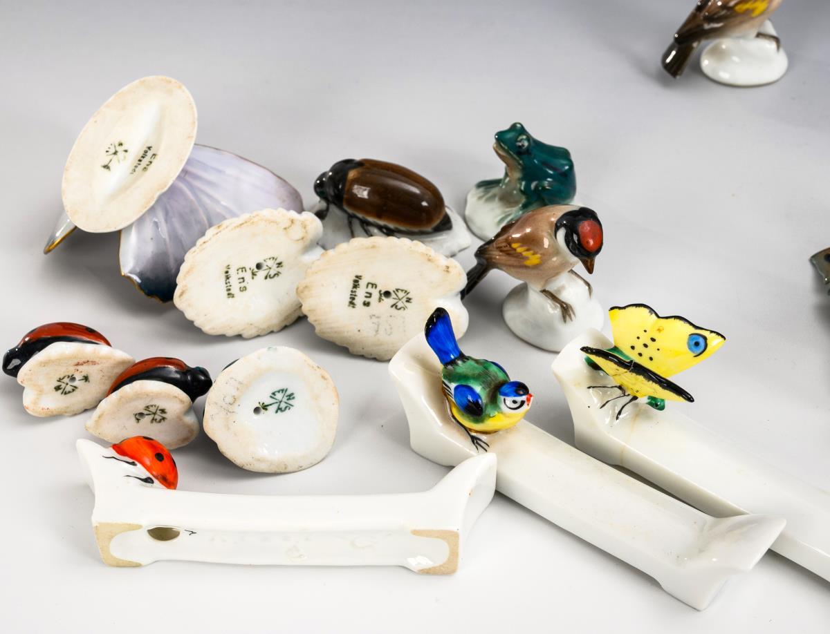 11x ENS: 3 Käfer, 2 Marienkäfer, 2 Frösche, 1 Schmetterling (H 2-4 cm) und 1 Vase (H 7 cm). / 6x GOEBEL: figürliche Messerbänkchen (mit Schmetterling, Zwerg, Fliegenpilzen, Hummel, Meise und Marienkäfer; L 9,5 cm). Messerbänkchen: 1x mit Haarriss, Zwerg und Schmetterling geklebt, Meisenschnabel bestoßen; Tiere: 1 Vogelschwanz geklebt.
