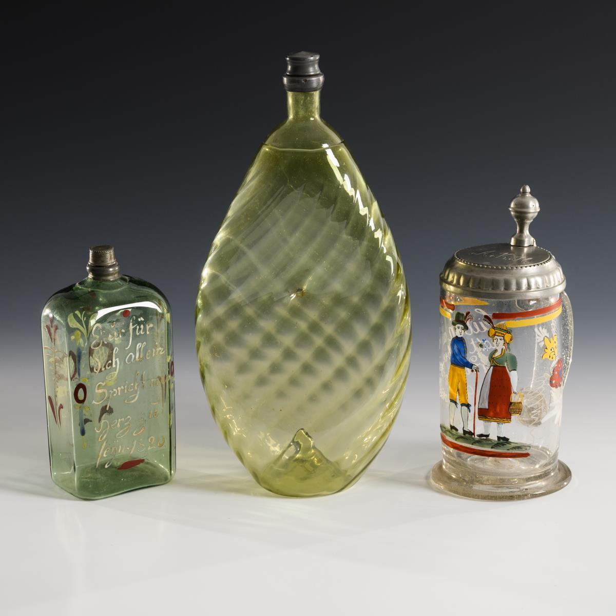 1x süddeutsch/Tirol: schrägoptisch geblasene Greifflasche aus olivgrünem Glas mit hochgestochenem Boden und eingedelltem "Nabel" in der Mitte; mit Abriss und Zinnverschluss (L 28,5 cm). / 1x Biedermeier-Walzenkrug aus farblosem Glas mit Bandhenkel und zinnmontiertem Scharnierdeckel; schauseitig ein polychrom emailgemaltes Paar sowie der Spruch "Lieben und nicht haben, ist härder den Steingraben. Anno 1834"; Abriss (H 19 cm). / 1x alpenländisch: Branntweinflasche aus grünem Glas mit Zinnschraubdeckel; schauseitig der Spruch "Nur für dich allein Spricht mein Herz zu seyn. 1820"; Abriss (H 16 cm).