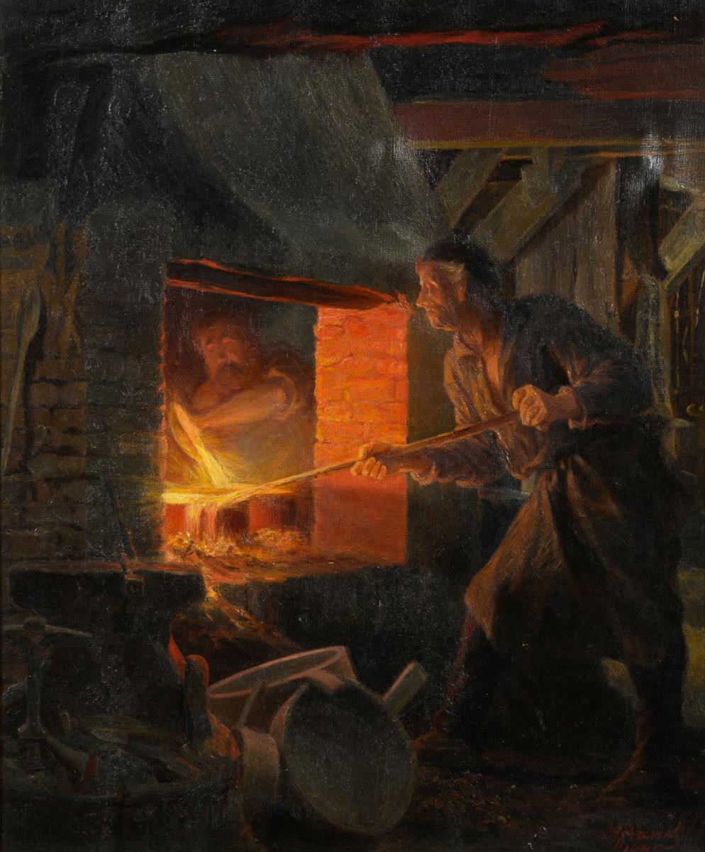 Die zwei Arbeiter am Ofen beim Gießen des Metalls.